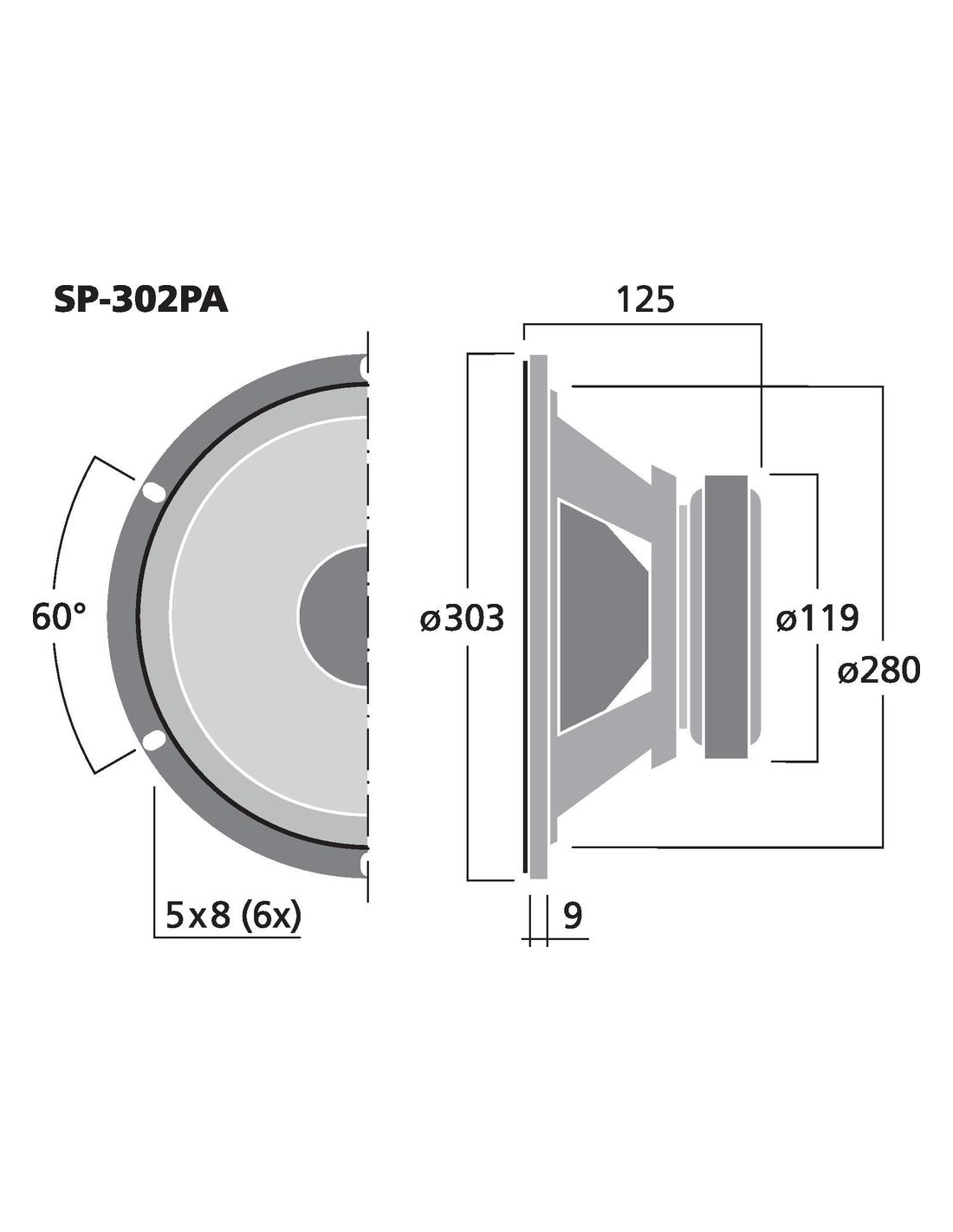 impedancia z :8 Ω:1:0,m todo de transmisi n:cable:2:0,rango de frecuencias:f3-4.000 Hz:3:0,frecuencia de resonancia fs :45 Hz:4:0,potencia nominal rms :100 W:5:0,pico de potencia musical max :200 W:6:0,sensibilidad:90 dB/W/m:7:0,pliegue susp cms :0,15 mm/N:8:0,masa m vil mms :57 g:9:0,factor q mec qms :2,2:10:0,factor q el ctrico qes :1,47:11:0,factor q total qts :0,89:12:0,volumen equivalente vas :51 l:13:0,resistencia dc re :7,7 Ω:14:0,factor de fuerza bxl :10,50 Tm:15:0,inductancia de la membrana le :0,5 mH:16:0,di metro de la membrana:Ø 38 mm:17:0,soporte de la membrana:Aluminio:18:0,excursi n lineal xmax :± 2,5 mm:19:0,superficie de emisi n sd :542 cm2:20:0,peso del im n:850 g:21:0,di metro del im n:Ø 119 mm:22:0,corte de montaje:Ø 280 mm:23:0,profundidad de montaje:116 mm:24:0,dimensiones:Ø 303 x 125 mm:25:0,di metro exterior:Ø 303 mm:26:0,ancho:Ø 303 mm:27:0,altura:Ø 303 mm:28:0,profundidad:125 mm:29:0,color:negro:30:0,temp ambiente admis :0 a 40 °C:31:0,peso:2,36 kg:32:0,uds por embalaje:1:33:0,tipo de altavoz:12":34:0,dimensiones del paquete b x h x p :0,315 x 0,135 x 0,315 m:35:0,peso bruto:2,5 kg:36:0,peso neto:2,36 kg:37:0,peso neto:2,36 kg:38:0