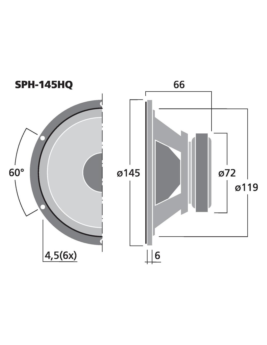 impedancia z :8 Ω:1:0,m todo de transmisi n:cable:2:0,rango de frecuencias:f3-6.000 Hz:3:0,frecuencia de resonancia fs :52 Hz:4:0,potencia nominal rms :50 W:5:0,pico de potencia musical max :100 W:6:0,sensibilidad:88 dB/W/m:7:0,pliegue susp cms :1,05 mm/N:8:0,masa m vil mms :7,6 g:9:0,factor q mec qms :3,07:10:0,factor q el ctrico qes :0,51:11:0,factor q total qts :0,44:12:0,volumen equivalente vas :9,4 l:13:0,resistencia dc re :5,8 Ω:14:0,factor de fuerza bxl :5,33 Tm:15:0,inductancia de la membrana le :0,53 mH:16:0,di metro de la membrana:Ø 25 mm:17:0,soporte de la membrana:Aluminio:18:0,excursi n lineal xmax :± 3,5 mm:19:0,superficie de emisi n sd :80 cm2:20:0,peso del im n:230 g:21:0,di metro del im n:Ø 72 mm:22:0,corte de montaje:Ø 119 mm:23:0,profundidad de montaje:60 mm:24:0,di metro del agujero de montaje:Ø 118 mm:25:0,dimensiones:Ø 145 x 66 mm:26:0,di metro exterior:Ø 145 mm:27:0,ancho:Ø 145 mm:28:0,altura:Ø 145 mm:29:0,profundidad:66 mm:30:0,color:negro:31:0,temp ambiente admis :0 a 40 °C:32:0,peso:0,739 kg:33:0,uds por embalaje:1:34:0,tipo de altavoz:5,5":35:0,dimensiones del paquete b x h x p :0,165 x 0,11 x 0,17 m:36:0,peso bruto:0,88 kg:37:0,peso neto:0,739 kg:38:0,peso neto:0,739 kg:39:0