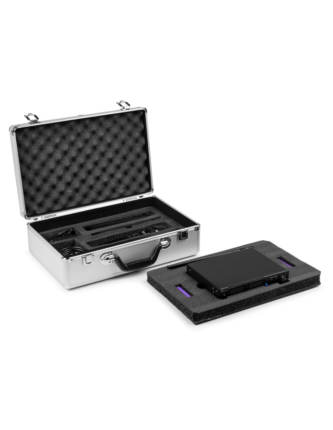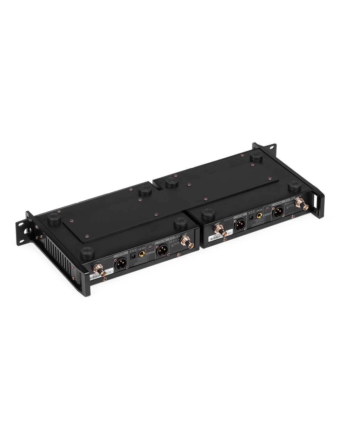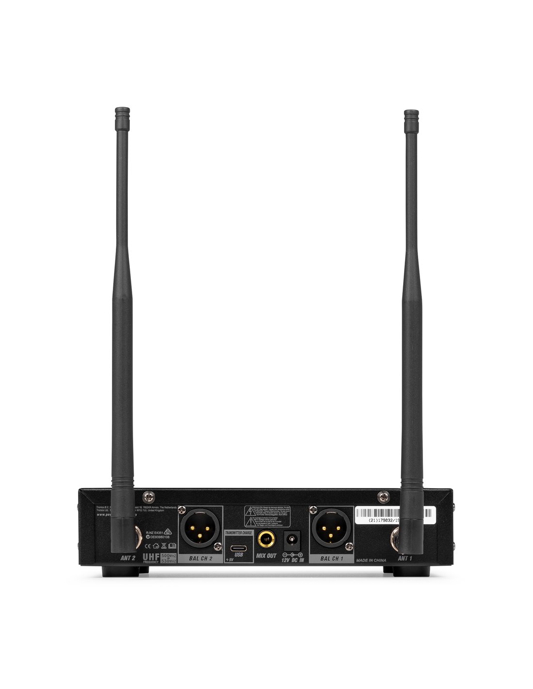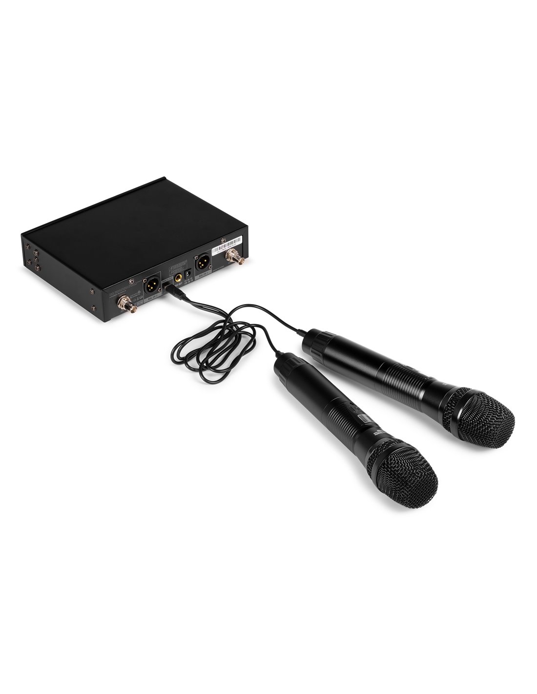 Este conjunto viene con un receptor UHF de 2 canales, 2 micrófonos de mano con batería recargable de iones de litio, dos antenas BNC extraíbles, dos cables extensores para el montaje frontal de las antenas, un adaptador de corriente y un caja de aluminio. También se incluyen cables USB para cargar los micrófonos inalámbricos.
