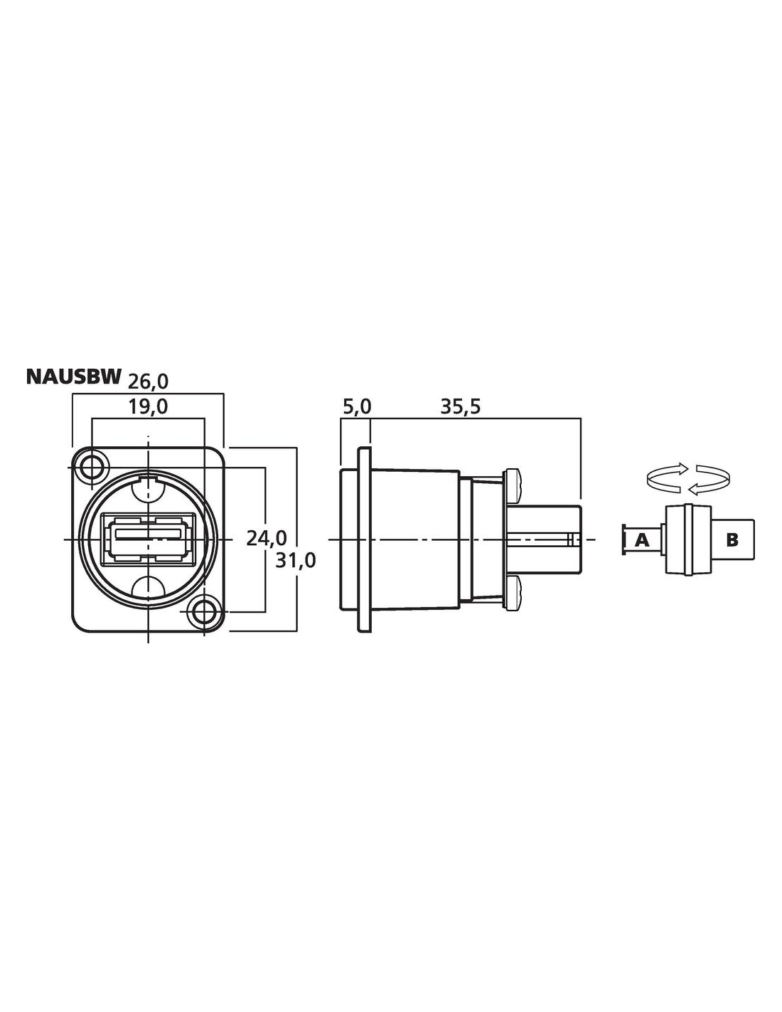 descripci n:toma de panel:1:0,tipo:USB de paso NEUTRIK:2:0,cantidad:1:3:0,caracter sticas:USB A/USB B:4:0,color codificaci n de color:niquelado:5:0,conexiones:2x USB:6:0,temp ambiente admis :-25 a 85 °C:7:0,dimensiones:26 x 31 x 40,5 mm:8:0,peso:30 g:9:0,caracter sticas:entrada reversible:10:0,peso neto:0,03 kg:11:0