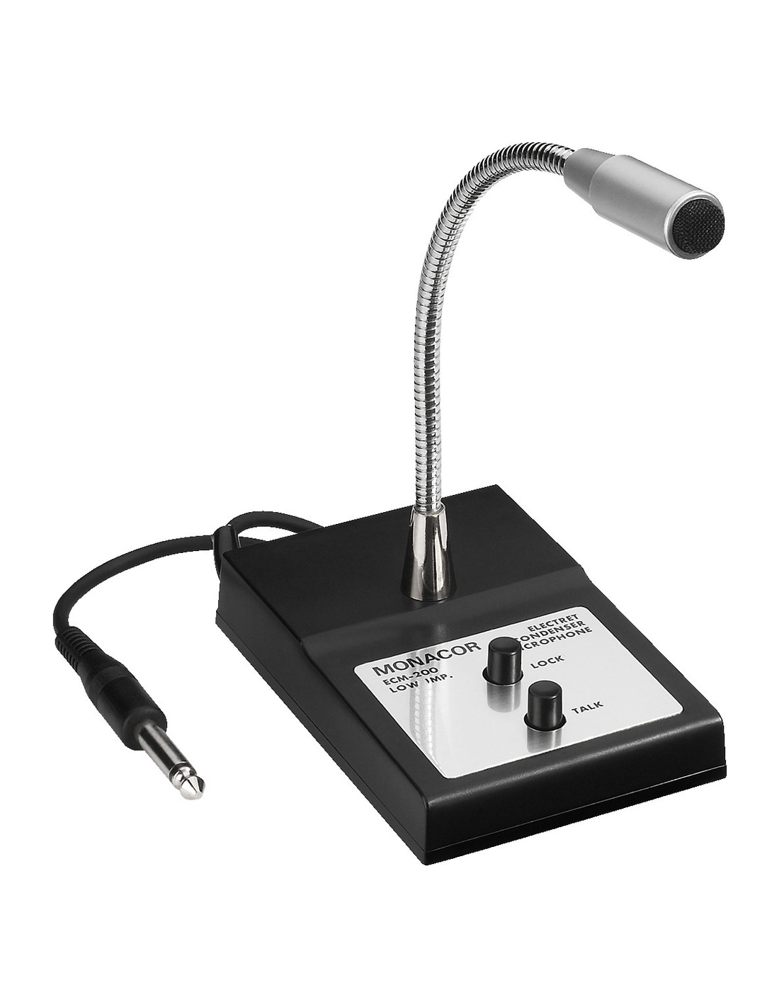 Descripción micrófono de sobremesa Método de transmisión cable Patrón direccional omnidir. Sistema electret Rango de frecuencias de audio 60-12.000 Hz Impedancia nominal 1 kΩ Sensibilidad 6 mV/Pa Relación señal / ruido > 40 dB Alimentación 1x bat. de 1,5 V AA Temp. ambiente admis. 0-40 °C Dimensiones 75 x 25 x 110 mm (consola), 200 mm (longitud del cuello de cisne) Peso 298 g Cable 3 m Conexiones jack 6,3 mm Dimensiones del paquete (B x H x P) 0,08 x 0,145 x 0,13 m Peso bruto 0,369 kg Peso neto 0,298 kg Peso neto 0,298 kg