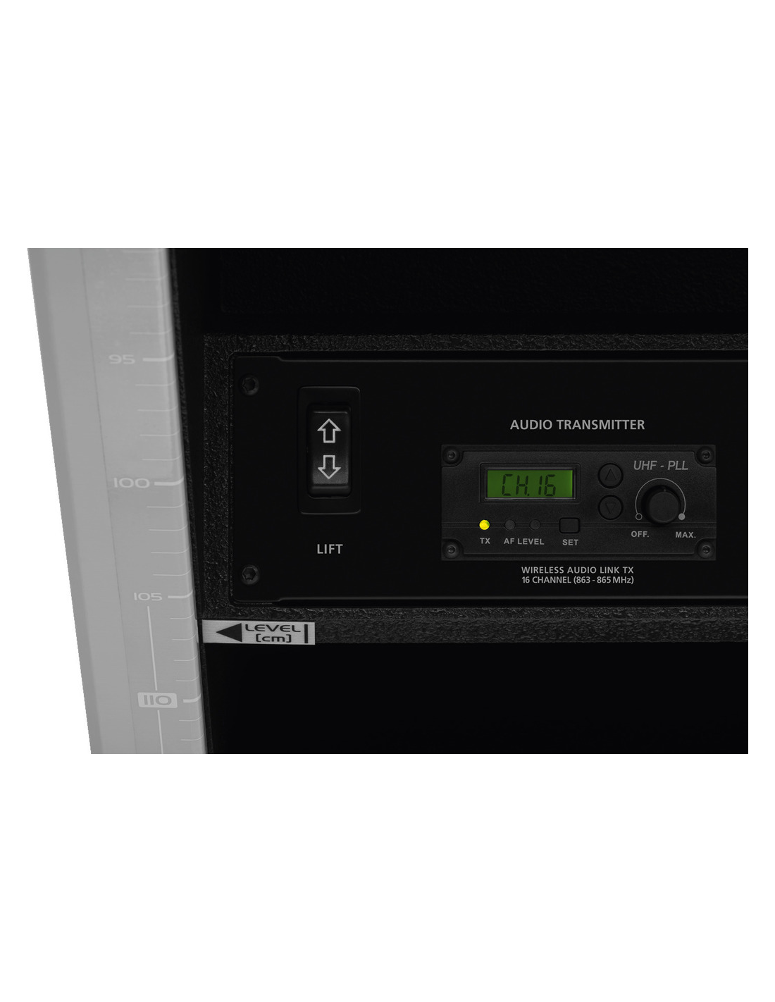 Potencia nominal (PRMS) 50 W Pico de potencia de salida 100 W Rango de frecuencias 50-20.000 Hz Frecuencia emisión 863,1-864,9 MHz Alcance ≤ 30 m Entradas 24 mV (mic 1-2, arriba), 4,5 mV (mic 1-3), 150 mV (línea 1-3), 400 mV (línea) SPL máx. 114 dB Ecualizador, graves ±12 dB/60 Hz Ecualizador, medios ±7 dB/1 kHz Ecualizador, agudos ±12 dB/15 kHz Alimentación ˜ 230 V/50 Hz/135 VA Temp. ambiente admis. 0-40 °C Dimensiones 800 x 850-1.250 x 570 mm Peso 52 kg Conexiones 3x XLR (mic), 3x jack 6,3 mm (línea), 1x RCA I/D (entrada de línea), 1x RCA I/D (salida de línea) Peso neto 51,95 kg DESCARGAS Datasheet Instruction manual Declaration of Conformity UKCA RED Declaration of Conformity CE RED