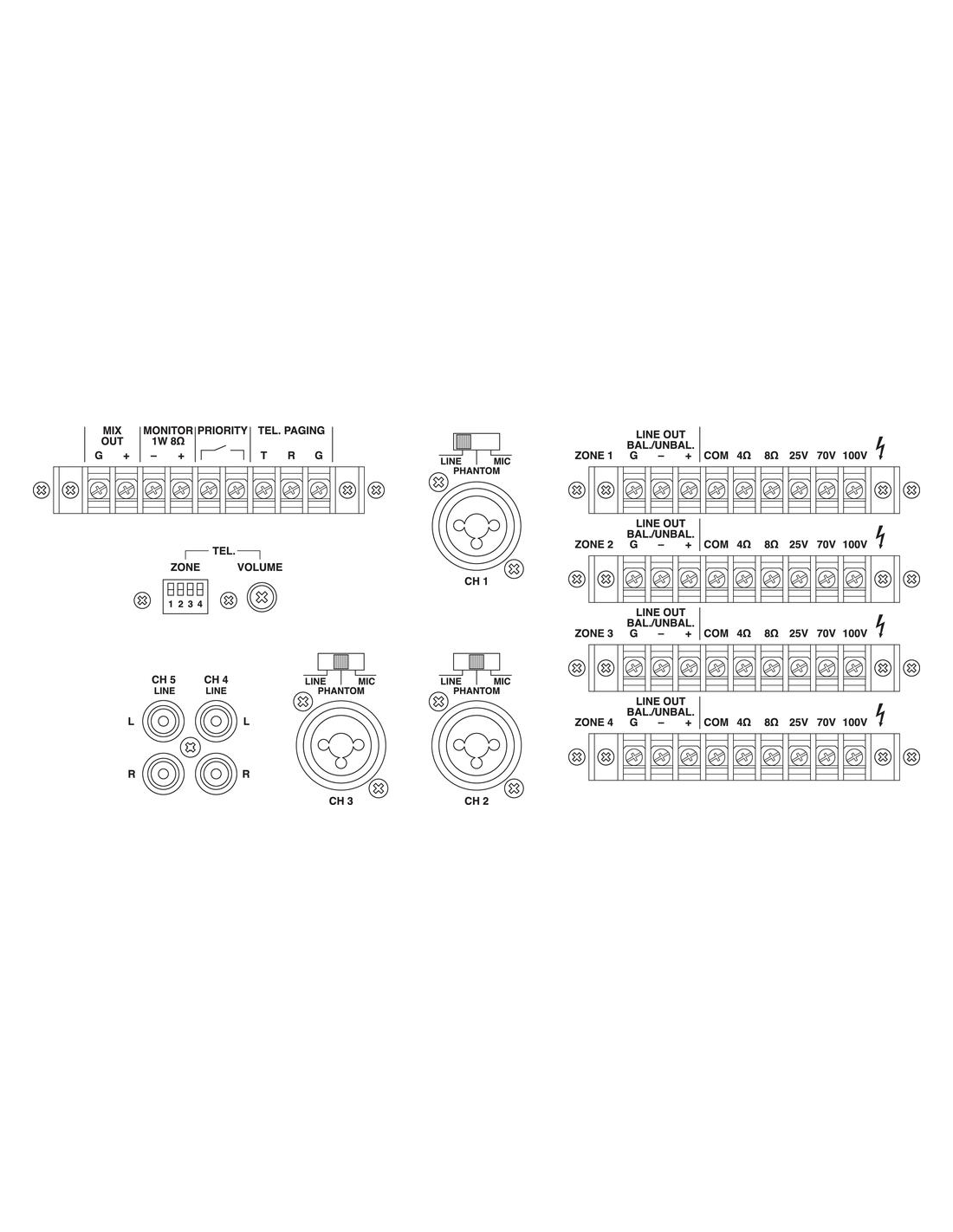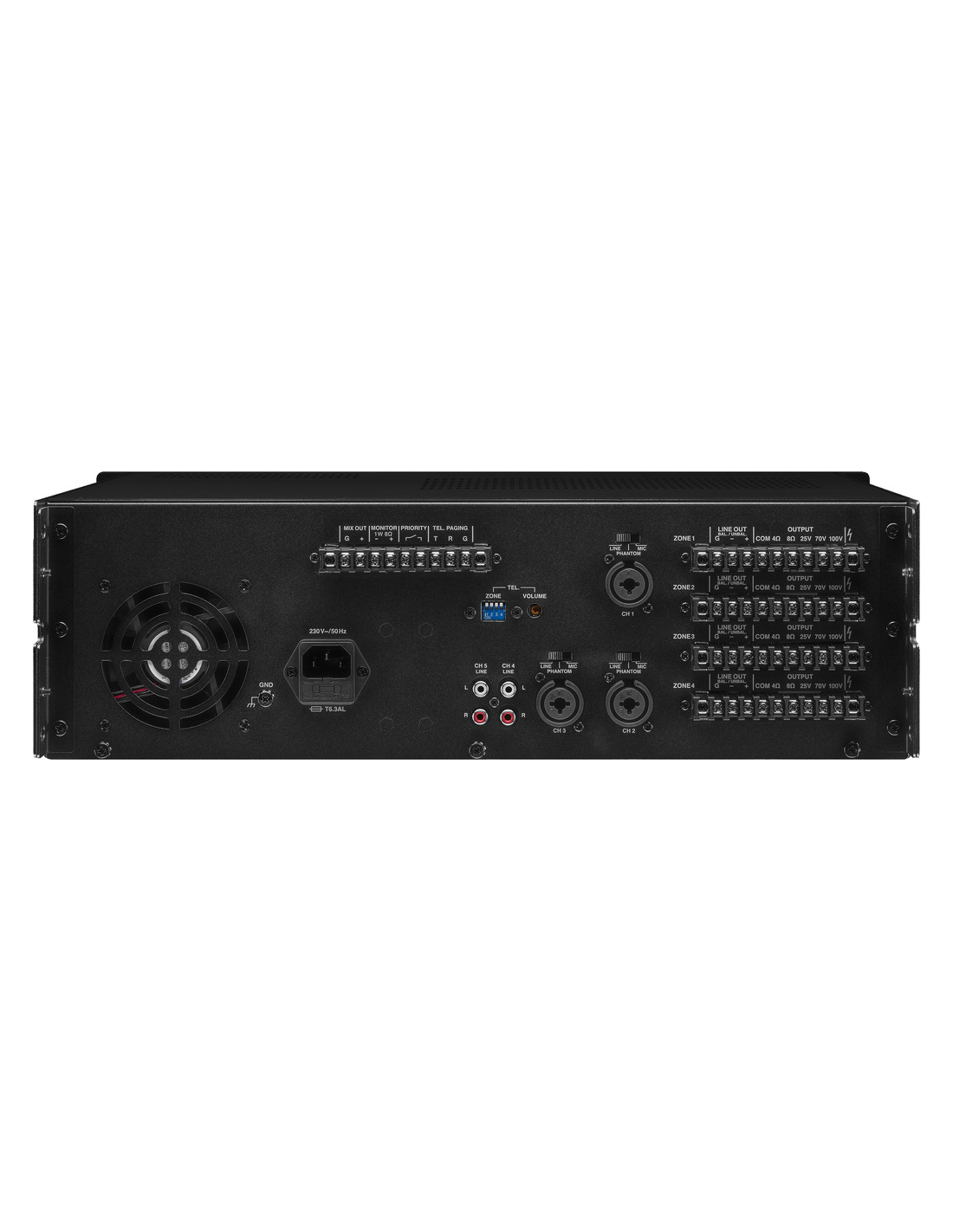 Pico de potencia de salida 4 x 170 W Potencia nominal 4 x 120 W Potencia nominal a 4 Ω 4 x 120 W Potencia nominal a 8 Ω 4 x 120 W Potencia nominal a 100 V 4 x 120 W Canales 5 Zonas 4 Entradas 5 mV/4 kΩ, 100 mV/10 kΩ (mic/línea) 100 mV/30 kΩ (línea) 40 mV/5 kΩ (teléfono) Rango de frecuencias 50-17.000 Hz Limitador integrado sí Ecualizador de graves ±10 dB/100 Hz Ecualizador de agudos ±10 dB/10 kHz Relación señal / ruido > 65 dB, mic > 75 dB, línea THD < 1 % Alimentación phantom 46 V Alimentación ˜ 230 V/50 Hz/1.200 VA Voltaje de corriente ~ 230 V Frecuencia de la corriente 50 Hz Consumo, funcionamiento 1.200 VA Temp. ambiente admis. 0 a 40 °C Ancho 482 mm Altura 133 mm Profundidad 410 mm Unidades rack, U 3 Peso 20,5 kg Conexiones 3 x comb. jack/XLR, sim. (entradas mic/línea) 2 x RCA L/R (entradas de línea) jack 3,5 mm (auriculares) terminales de rosca (paginación), terminales de rosca (prioridad), terminales de rosca (entradas de zona), terminales de rosca (salidas de línea), terminales de rosca (altavoces) Dimensiones del paquete (B x H x P) 0,57 x 0,24 x 0,52 m Peso bruto 23,7 kg Peso neto 20,66 kg Peso neto 20,66 kg DESCARGAS Datasheet Declaration of Conformity UKCA Declaration of Conformity CE Instruction manual