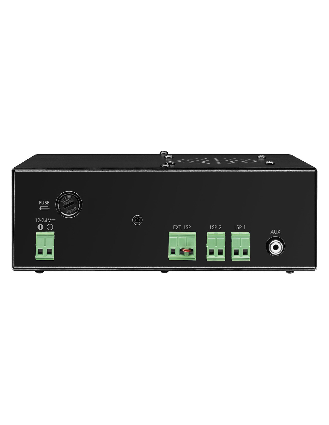 Pico de potencia de salida 20 W Potencia nominal 14 W Potencia nominal a 4 Ω 14 W Canales 2 Entradas 3 mV (mic), 50 mV (línea) Rango de frecuencias 20-20.000 Hz Relación señal / ruido 65 dB THD < 0,5 % Alimentación DC 12-15 V/2 A, DC 24 V/1 A Temp. ambiente admis. 0 a 40 °C Ancho 175 mm Altura 60 mm Profundidad 170 mm Peso 1,4 kg Conexiones 1 x jack 6,3 mm (entrada mic), 1 x RCA (entrada de línea), 2 x terminal de rosca de 2 polos (altavoces), 1 x terminal de rosca de 3 polos con jumper (altavoz externo) Dimensiones del paquete (B x H x P) 0,23 x 0,1 x 0,3 m Peso bruto 1,84 kg Peso neto 1,41 kg Peso neto 1,41 kg DESCARGAS Datasheet Declaration of Conformity CE Declaration of Conformity UKCA Instruction manual