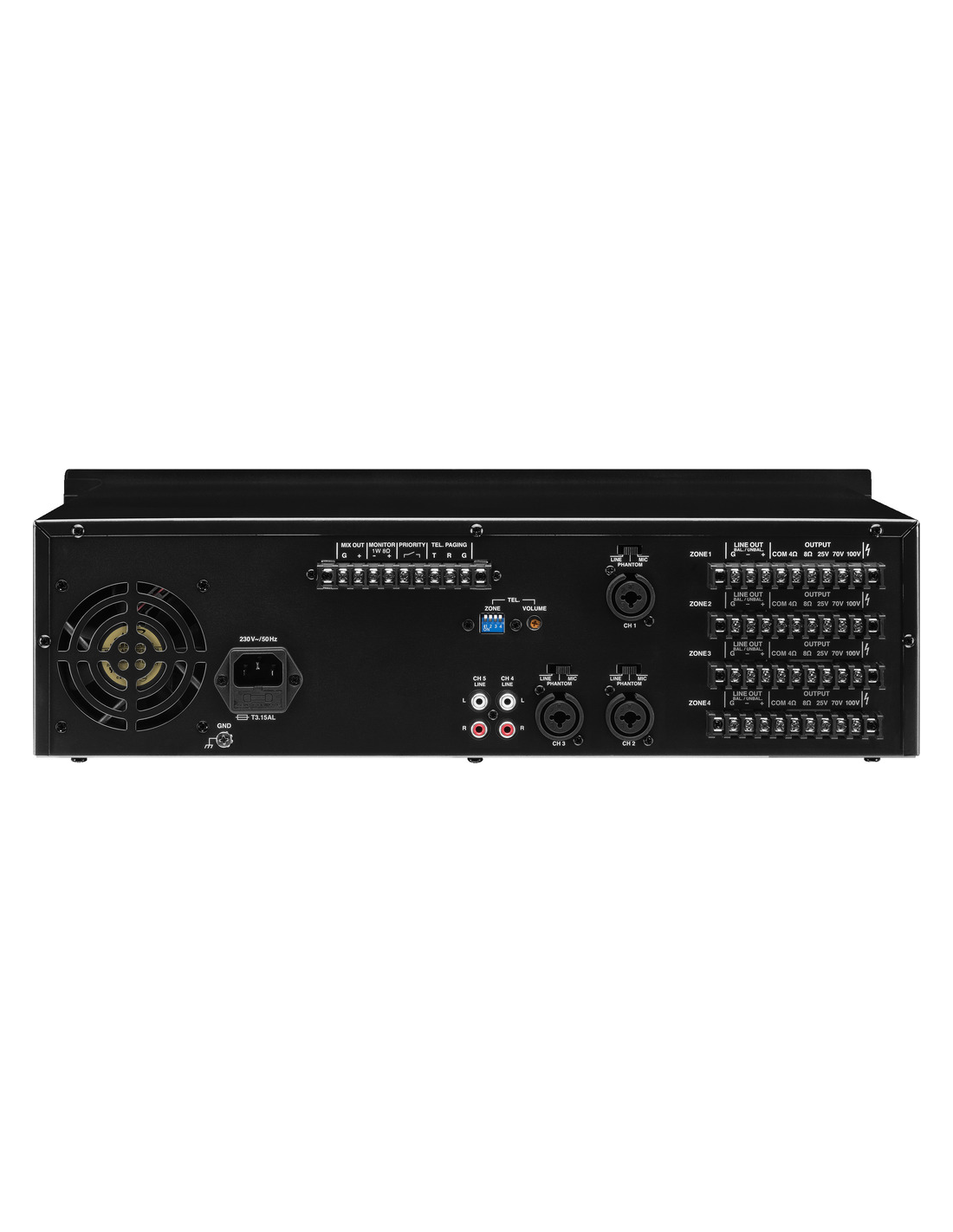Pico de potencia de salida 4 x 65 W Potencia nominal 4 x 40 W Potencia nominal a 4 Ω 4 x 40 W Potencia nominal a 8 Ω 4 x 40 W Potencia nominal a 100 V 4 x 40 W Canales 5 Zonas 4 Entradas 5 mV/4 kΩ, 100 mV/10 kΩ (mic/línea), 100 mV/30 kΩ (línea) Rango de frecuencias 50-17.000 Hz Limitador integrado sí Ecualizador de graves ±10 dB/100 HZ Ecualizador de agudos ±10 dB/10 kHz Relación señal / ruido > 65 dB (mic), > 75 dB (línea) THD < 1 % Alimentación phantom 15 V Alimentación ˜ 230 V/50 Hz/450 VA Voltaje de corriente ~ 230 V Frecuencia de la corriente 50 Hz Consumo, funcionamiento 450 VA Temp. ambiente admis. 0 a 40 °C Ancho 482 mm Altura 133 mm Profundidad 310 mm Unidades rack, U 3 Peso 15 kg Conexiones 3x comb. 6,3 mm/XLR (mic/línea), 2x RCA L/R (línea), terminal de rosca (salida mix), terminales de rosca (paging), terminales de rosca (prioridad), jack 3,5 mm estéreo (auriculares), terminales de rosca (zona de altavoces) terminales de rosca (altavoces monitor) Dimensiones del paquete (B x H x P) 0,43 x 0,23 x 0,56 m Peso bruto 18,46 kg Peso neto 15,92 kg Peso neto 15,92 kg DESCARGAS Datasheet Instruction manual Declaration of Conformity CE Declaration of Conformity UKCA A172520Z