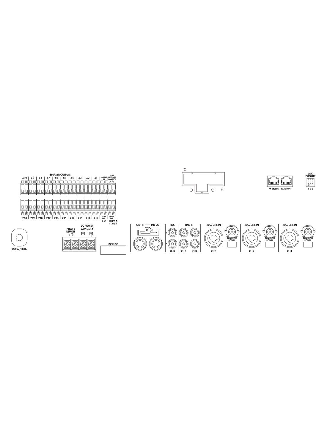 Pico de potencia de salida 600 W Potencia nominal 600 W Potencia nominal a 4 Ω 600 W Potencia nominal a 100 V 600 W Canales 5 Zonas 20 Entradas 2,5 mV/5 kΩ, 0,3 V/5 kΩ (mic/línea 1-3), 0,3 V/15 kΩ (línea 4-5), 0,775 V/100 kΩ (preamplificador) Rango de frecuencias 55-16.000 Hz Ecualizador de graves ±10 dB/100 Hz Ecualizador de agudos ±10 dB/10 kHz Relación señal / ruido > 70 dB (mic), > 80 dB (línea) THD < 1 % Alimentación phantom 15 V Alimentación ˜ 230 V/50 Hz/1.700 VA, DC 24 V/50 A Voltaje de corriente ~ 230 V Frecuencia de la corriente 50 Hz Consumo, funcionamiento 1.700 VA Voltaje de funcionamiento (alternativo) DC 24 V Alimentación (alternativa) DC 50 A Temp. ambiente admis. 0 a 40 °C Ancho 482 mm Altura 133 mm Profundidad 352 mm Unidades rack, U 3 Peso 21 kg Conexiones 3 x comb. 6,3 mm/XLR (mic/línea), 2 x RCA L/R (línea), 1 x jack 6,3 mm (entrada del preamplificador), 1 x RJ45 (micrófono PTT), 1 x RJ45 (micrófono con control de zonas), 1 x RCA L/R (salida de grabación) 1x jack 6,3 mm (salida del preamplificador), terminales de rosca (botón chime), terminales de rosca (altavoces) Dimensiones del paquete (B x H x P) 0,54 x 0,21 x 0,47 m Peso bruto 22,9 kg Peso neto 21 kg Peso neto 21 kg DESCARGAS Datasheet 2D PDF drawing Declaration of Conformity CE Declaration of Conformity UKCA A1000126Z Instruction manual