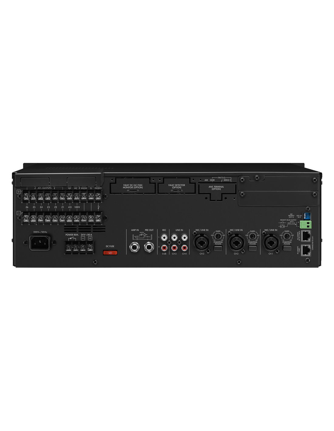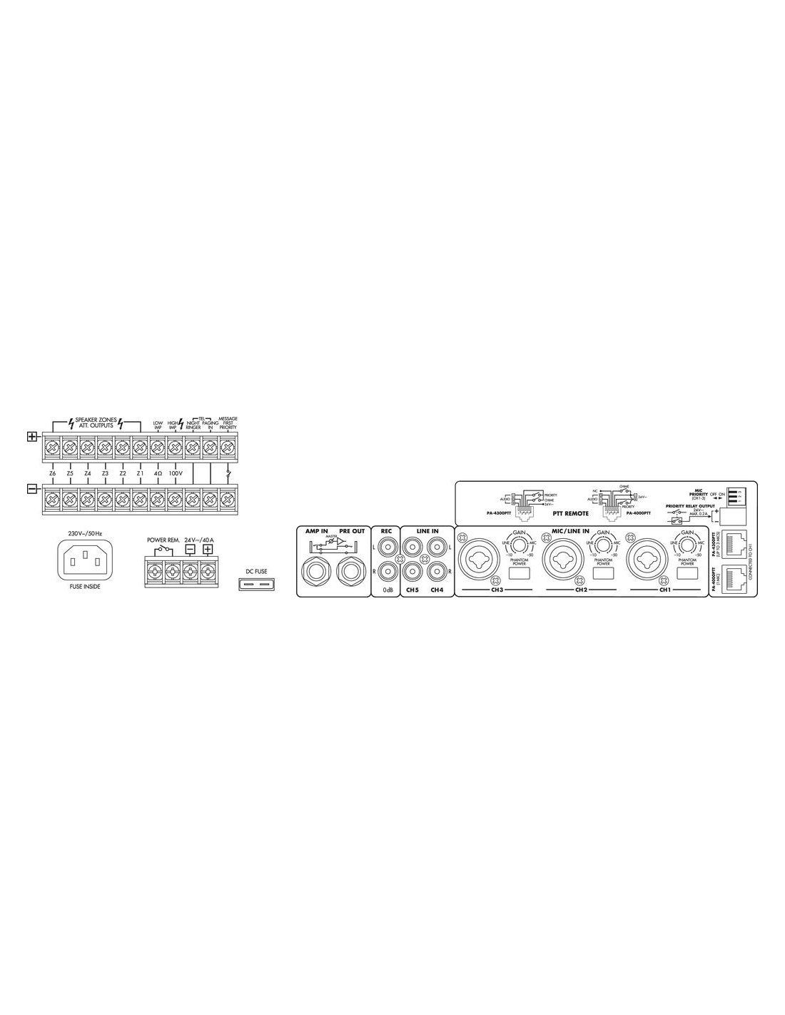 Pico de potencia de salida 680 W Potencia nominal 480 W Potencia nominal a 4 Ω 480 W Canales 5 Zonas 6 Entradas 2,5 mV/5 kΩ, 0,3 V/5 kΩ (mic/línea), 0,3 V/15 kΩ (línea), 0,775 V/10 kΩ (preamplificador) Rango de frecuencias 55-16.000 Hz Ecualizador de graves ±10 dB/100 Hz Ecualizador de agudos ±10 dB/10 kHz Relación señal / ruido > 70 dBA (mic), > 80 dBA (línea) THD < 1 % Alimentación phantom 17 V Alimentación ˜ 230 V/50 Hz/1.500 VA, DC  24 V/40 A Voltaje de corriente ~ 230 V Frecuencia de la corriente 50 Hz Consumo, funcionamiento 1.500 VA Voltaje de funcionamiento (alternativo) DC 24 V Alimentación (alternativa) DC 40 A Temp. ambiente admis. 0 a 40 °C Ancho 430 mm Altura 133 mm Profundidad 352 mm Unidades rack, U 3 Peso 19 kg Conexiones 3 x combo 6,3 mm/XLR (mic/línea), 2 x RCA L/R (línea), 1 x jack 6,3 mm (preamplificador), 1 x RJ45 (micrófono PTT), terminales de rosca (sistema telefónico), 1 x jack 6,3 mm (amplificador ext.), 1 x RCA L/R (record),  terminales de rosca (altavoces) Dimensiones del paquete (B x H x P) 0,48 x 0,22 x 0,54 m Peso bruto 20,98 kg Peso neto 19,1 kg Peso neto 19,1 kg DESCARGAS Datasheet Declaration of Conformity CE Instruction manual Declaration of Conformity UKCA Instruction manual 2D PDF drawing A172190Z-0