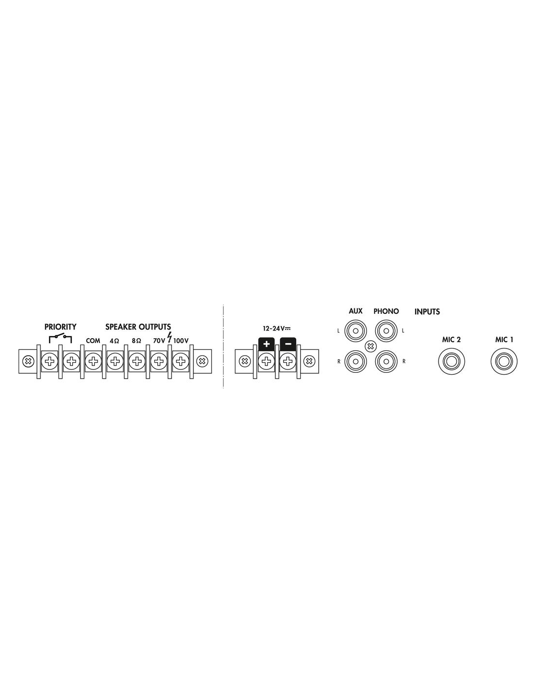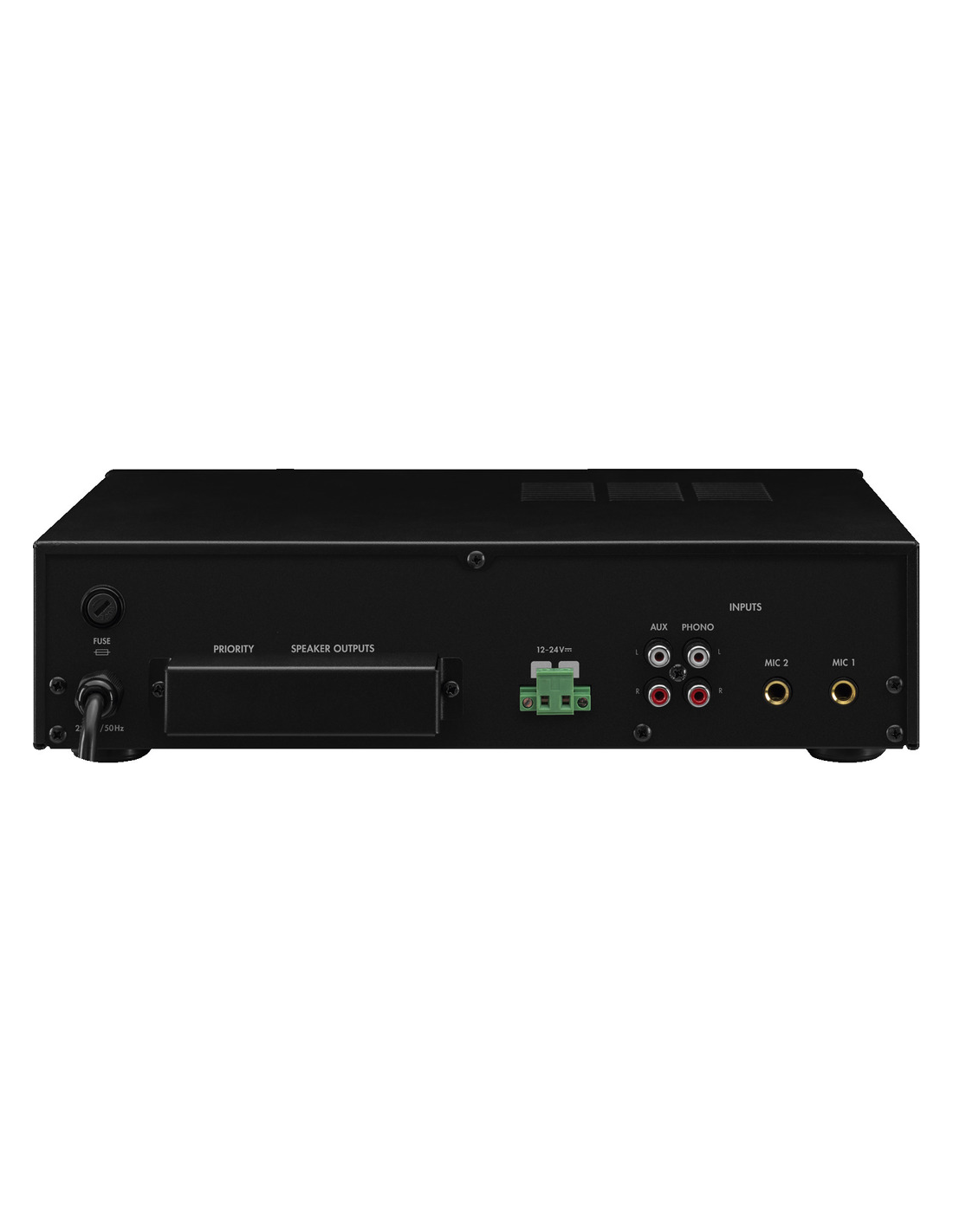 Pico de potencia de salida 70 W Potencia nominal 35 W Potencia nominal a 4 Ω 35 W Potencia nominal a 8 Ω 35 W Potencia nominal a 100 V 35 W Canales 4 Entradas 5 mV (mic), 210 mV (aux), 5 mV (phono) Rango de frecuencias 100-18.000 Hz Ecualizador de graves ±10 dB/150 Hz Ecualizador de agudos ±10 dB/6 kHz Relación señal / ruido > 55 dB THD < 1 % Alimentación ˜ 230 V/50 Hz/100 VA DC  12-24 V/2,5 A Voltaje de corriente ~ 230 V Frecuencia de la corriente 50 Hz Consumo, funcionamiento 100 VA Voltaje de funcionamiento (alternativo) DC 12-24 V Alimentación (alternativa) DC 2,5 A Temp. ambiente admis. 0 a 40 °C Ancho 320 mm Altura 85 mm Profundidad 230 mm Peso 4,97 kg Conexiones 2 x jack 6,3 mm (mic), 1 x RCA L/R (aux), 1 x RCA L/R (phono), terminales de rosca (altavoces) Dimensiones del paquete (B x H x P) 0,37 x 0,14 x 0,28 m Peso bruto 5,33 kg Peso neto 4,97 kg Peso neto 4,97 kg DESCARGAS Datasheet Declaration of Conformity UKCA Declaration of Conformity CE Instruction manual A0179480Z