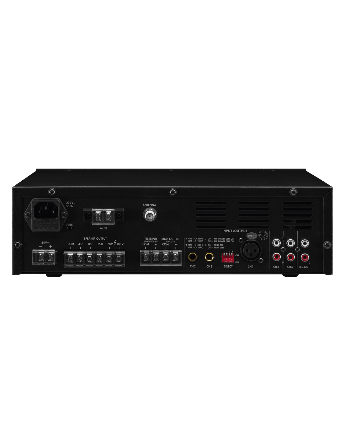 Pico de potencia de salida 30 W Potencia nominal 30 W Potencia nominal a 4 Ω 30 W Potencia nominal a 8 Ω 30 W Potencia nominal a 16 Ω 30 W Potencia nominal a 100 V 30 W Canales 1 Zonas 1 Entradas 4,5 mV/600 Ω (canal 1), 120 mV (canales 2-3), 60 mV (canales 4-5) 90 mV (tel.) Rango de frecuencias 60-15.000 Hz Ecualizador de graves sí Ecualizador de agudos sí Relación señal / ruido 72 dB (mic, canales 1-3) 85 dB (línea, canales2-5) THD < 0,5 % Alimentación phantom 48 V Alimentación ˜ 230 V/50 Hz/100 VA DC  24 V/2,5 A Voltaje de corriente ~ 230 V Frecuencia de la corriente 50 Hz Consumo, funcionamiento 100 VA Voltaje de funcionamiento (alternativo) DC 24 V Alimentación (alternativa) 2,5 A Temp. ambiente admis. 0 a 40 °C Ancho 320 mm Altura 95 mm Profundidad 245 mm Peso 3,95 kg Conexiones 1 x XLR (canal 1), 2 x jack 6,3 mm (canales 2-3), 2 x RCA L/R (canales 4-5), 2 x RCA (salida record), 1 x toma F (FM/DAB+), terminales de rosca (entrada tel.), terminales de rosca (MOH), terminales de rosca ( DC 24 V), terminales de rosca (silencio),  terminales de rosca (altavoces) Dimensiones del paquete (B x H x P) 0,39 x 0,16 x 0,31 m Peso bruto 4,33 kg Peso neto 3,74 kg Peso neto 3,74 kg DESCARGAS Datasheet Instruction manual Declaration of Conformity UKCA RED Declaration of Conformity CE RED A1000168Z-0