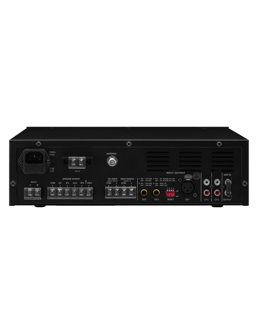 Pico de potencia de salida 120 W Potencia nominal 120 W Potencia nominal a 4 Ω 120 W Potencia nominal a 8 Ω 120 W Potencia nominal a 16 Ω 120 W Potencia nominal a 100 V 120 W Canales 1 Zonas 1 Entradas 4.5 mV/600 Ω (canal 1), 4.5 mV/120 mV (canales 2-3), 60 mV (canales 4-5) 90 mV (tel.) Rango de frecuencias 60-15.000 Hz Ecualizador de graves ± 10 dB Ecualizador de agudos ± 10 dB Relación señal / ruido 72 dB (mic, canales 1-3) 85 dB (línea, canales 2-5) THD < 0,5 % Alimentación phantom 48 V Voltaje de corriente ~ 230 V Frecuencia de la corriente 50 Hz Consumo, funcionamiento 250 VA Voltaje de funcionamiento (alternativo) DC 24 V Alimentación (alternativa) 8,4 A Temp. ambiente admis. 0 a 40 °C Ancho 320 mm Altura 95 mm Profundidad 245 mm Peso 4,5 kg Conexiones 1 x XLR (canal 1), 2 x jack 6,3 mm (canales 2-3) 2 x RCA L/R (canales 4-5), 1 x RCA (entrada amp), 1 x RCA (salida preamp), 1 x F jack (FM/DAB+), terminales de rosca (entrada tel.), terminales de rosca (MOH), terminales de rosca ( DC 24 V), terminales de rosca (silencio)  terminales de rosca (altavoces) Dimensiones del paquete (B x H x P) 0,395 x 0,16 x 0,305 m Peso bruto 5,2 kg Peso neto 4,51 kg Peso neto 4,51 kg DESCARGAS Datasheet Instruction manual Declaration of Conformity UKCA RED Declaration of Conformity CE RED A1000235Z