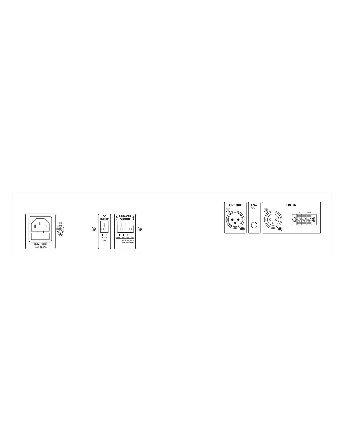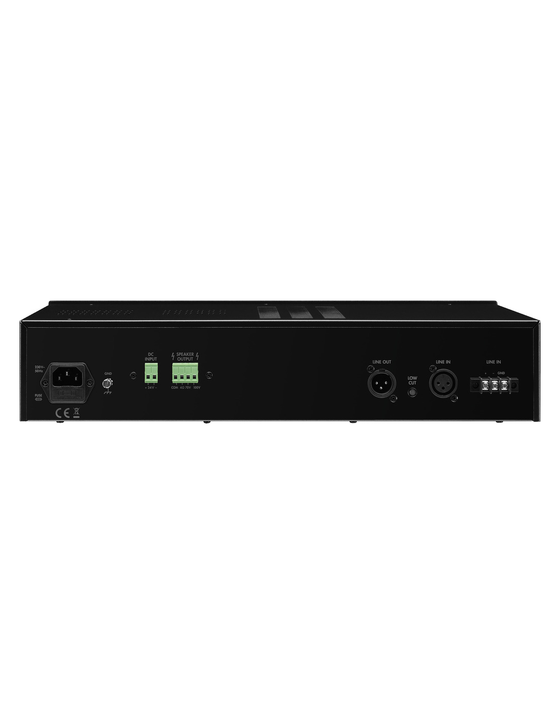 Pico de potencia de salida 160 W Potencia nominal 120 W Potencia nominal a 4 Ω 120 W Potencia nominal a 100 V 120 W Impedancia de salida 4 Ω, 70 V/ 100 V Canales 1 Entradas 765 mV (línea) Rango de frecuencias 50-15.000 Hz Ecualizador de graves ±10 dB/100 Hz Ecualizador de agudos ±10 dB/10 kHz Relación señal / ruido > 80 dB THD < 0,5 % Alimentación ˜ 230 V/50 Hz/300 VA, DC 24 V/9 A Voltaje de corriente ~ 230 V Frecuencia de la corriente 50 Hz Consumo, funcionamiento 300 VA Voltaje de funcionamiento (alternativo) DC 24 V Alimentación (alternativa) DC 9 A Temp. ambiente admis. 0 a 40 °C Ancho 482 mm Altura 88 mm Profundidad 275 mm Unidades rack, U 2 Peso 9,5 kg Conexiones 1 x XLR, terminales de rosca (entrada de línea), 1 x XLR (salida de línea), terminales de rosca (altavoces) Dimensiones del paquete (B x H x P) 0,33 x 0,16 x 0,52 m Peso bruto 11,31 kg Peso neto 9,86 kg Peso neto 9,86 kg DESCARGAS Datasheet Declaration of Conformity UKCA Instruction manual Declaration of Conformity CE