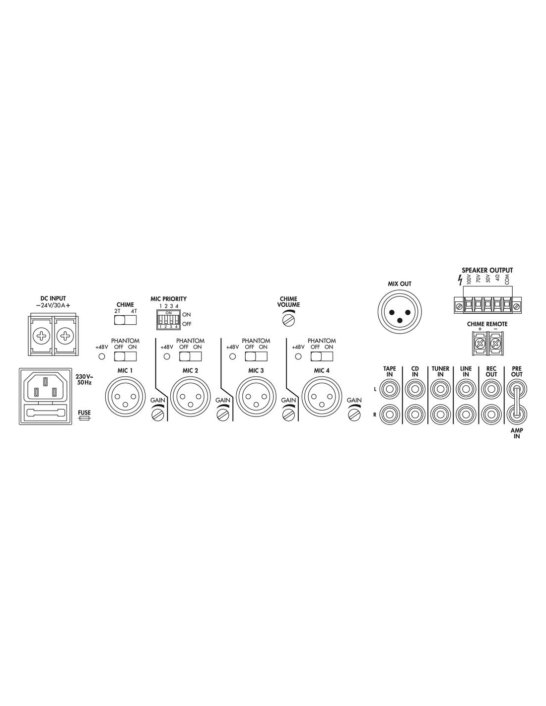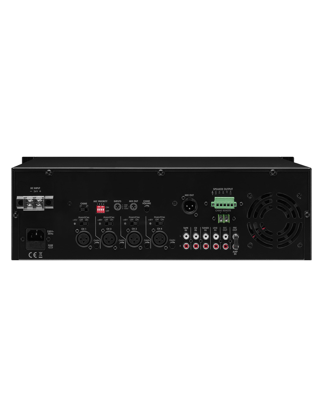 Pico de potencia de salida 680 W Potencia nominal 480 W Potencia nominal a 4 Ω 480 W Potencia nominal a 100 V 480 W Canales 5 Entradas 2,5-100 mV (mic), 350 mV (línea) Rango de frecuencias 50-16.000 Hz Ecualizador de graves ±10 dB/100 Hz Ecualizador de agudos ±10 dB/10 kHz Relación señal / ruido > 75 dB THD < 0,1 % Alimentación phantom 48 V Alimentación ˜ 230 V/50 Hz/1.090 VA, DC 24 V/27 A Voltaje de corriente ~ 230 V Frecuencia de la corriente 50 Hz Consumo, funcionamiento 1.090 VA Voltaje de funcionamiento (alternativo) DC 24 V Alimentación (alternativa) DC 27 A Temp. ambiente admis. 0 a 40 °C Ancho 482 mm Altura 137 mm Profundidad 395 mm Unidades rack, U 3 Peso 19 kg Conexiones 4 XLR (Mic), 4 RCA L/R (Línea), 1 XLR (salida de línea), 1 RCA L/R (salida de línea), Contactos roscados (altavoz) Dimensiones del paquete (B x H x P) 0,5 x 0,225 x 0,55 m Peso bruto 21,96 kg Peso neto 18,81 kg Peso neto 18,81 kg DESCARGAS Datasheet Declaration of Conformity CE Declaration of Conformity UKCA Instruction manual A175070Z