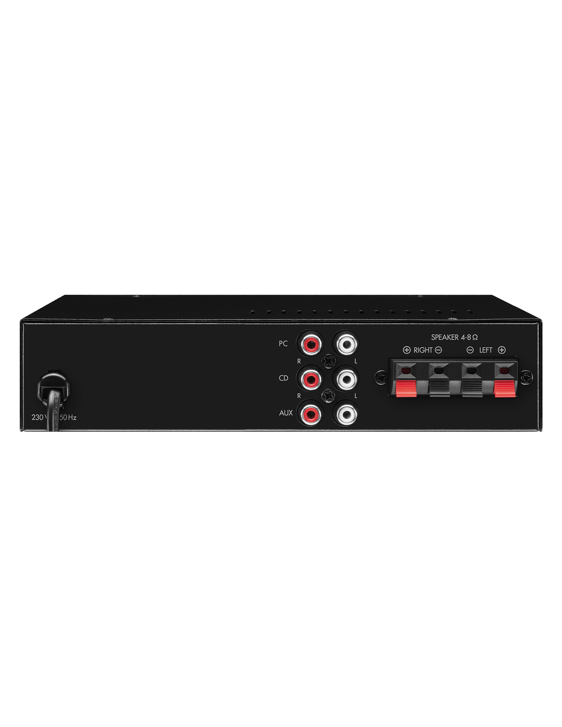Pico de potencia de salida 2 x 25 W Potencia nominal 25 W Potencia nominal a 4 Ω 2 x 12,5 W Potencia nominal a 8 Ω 2 x 10 W Canales 2 Entradas 115 mV/12 kΩ (PC), 115 mV/12 kΩ (CD), 115 mV/12 kΩ (aux), 115 mV/12 kΩ (lector, high), 20 mV/32 kΩ (lector, low) Rango de frecuencias 20-20.000 Hz Ecualizador de graves ± 12 dB Ecualizador de agudos ± 12 dB Relación señal / ruido > 65 dB Alimentación ˜ 230 V/50 Hz/50 VA Voltaje de corriente ~ 230 V Frecuencia de la corriente 50 Hz Consumo, funcionamiento 50 VA Temp. ambiente admis. 0 a 40 °C Ancho 212 mm Altura 56 mm Profundidad 200 mm Peso 1,8 kg Conexiones 1x RCA I/D (PC), 1x RCA I/D (CD), 1x RCA I/D (aux), 1x jack 3,5 mm (lector), 4x term. de altavoz con resorte (altavoces) Dimensiones del paquete (B x H x P) 0,21 x 0,057 x 0,21 m Peso bruto 2,18 kg Peso neto 1,85 kg Peso neto 1,85 kg DESCARGAS Datasheet Declaration of Conformity CE Declaration of Conformity UKCA Instruction manual H254620Z