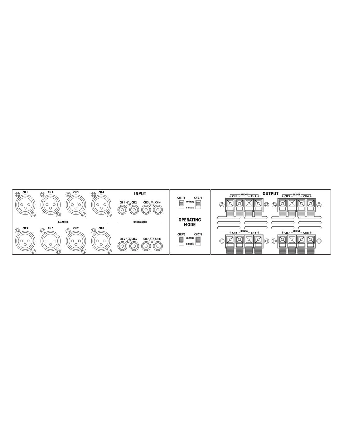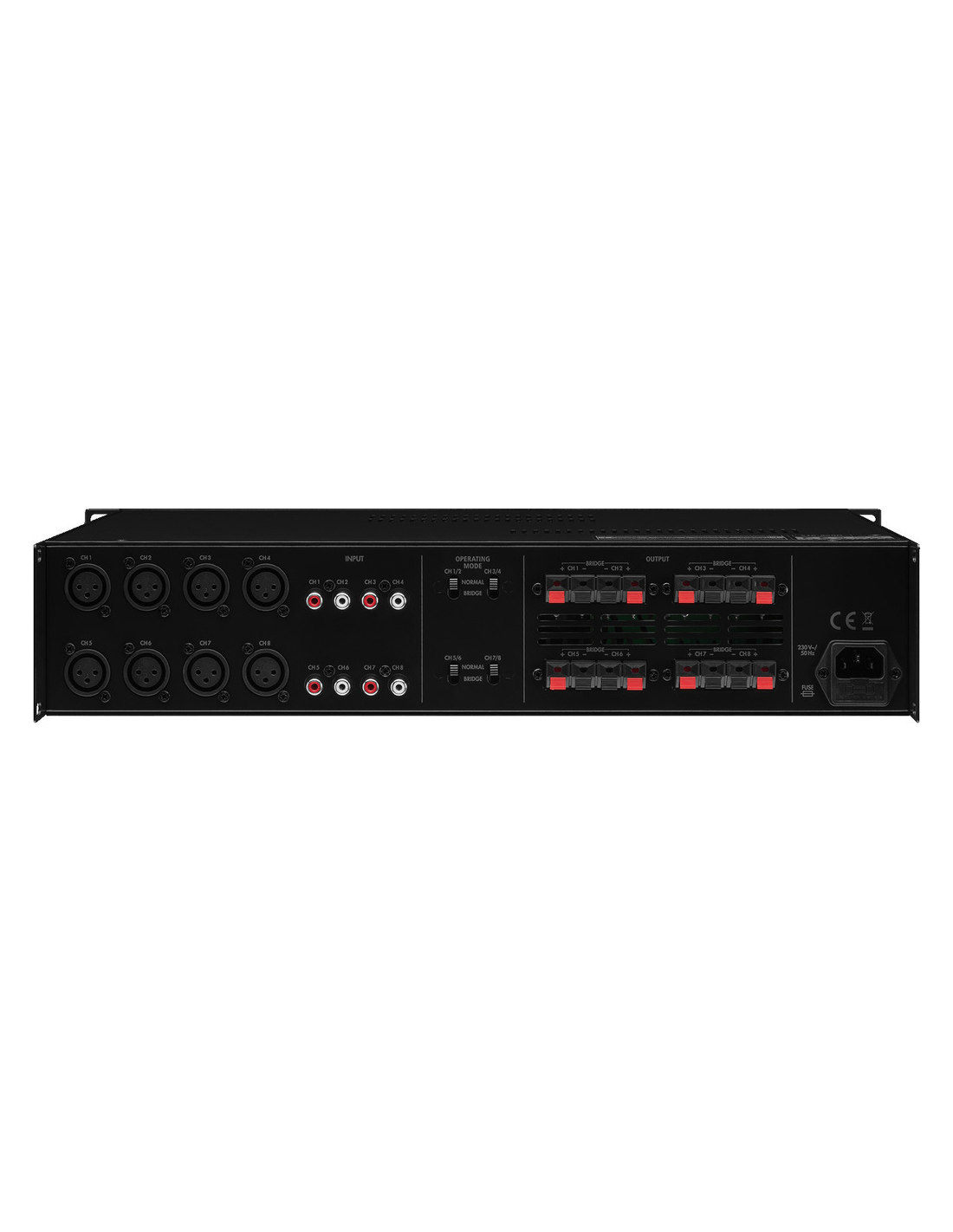 Pico de potencia de salida 600 W Potencia nominal 400 W Potencia nominal a 4 Ω 8 x 50 W Potencia nominal a 8 Ω 8 x 30 W Potencia nominal punteada a 8 Ω 4 x 100 W Canales 8 Entradas 1 V/20 kΩ asim. 550 mV/20 kΩ sim. Rango de frecuencias 10-20.000 Hz Atenuación > 45 dB Alimentación ˜ 230 V/50 Hz/600 VA Voltaje de corriente ~ 230 V Frecuencia de la corriente 50 Hz Consumo, funcionamiento 600 VA Temp. ambiente admis. 0 a 40 °C Ancho 483 mm Altura 90 mm Profundidad 330 mm Unidades rack, U 2 Peso 10,5 kg Conexiones 8 x XLR, sim. 8 x RCA 8 x term. de altavoz con resorte L/R Dimensiones del paquete (B x H x P) 0,41 x 0,16 x 0,56 m Peso bruto 13,22 kg Peso neto 10,68 kg Peso neto 10,68 kg DESCARGAS Datasheet Instruction manual Declaration of Conformity CE Declaration of Conformity UKCA