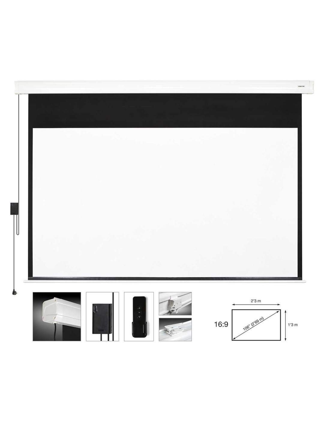 CARACTERÍSTICAS | Pantalla de proyección eléctrica. Motor tubular silencioso y rápido. Carcasa de perfil de aluminio, diseño elegante. Pulsadores de subida, bajada y parada. Mando a distancia RF. Final de recorrido ajustable. Instalación en pared o techo, soportes de instalación incluidos. | |