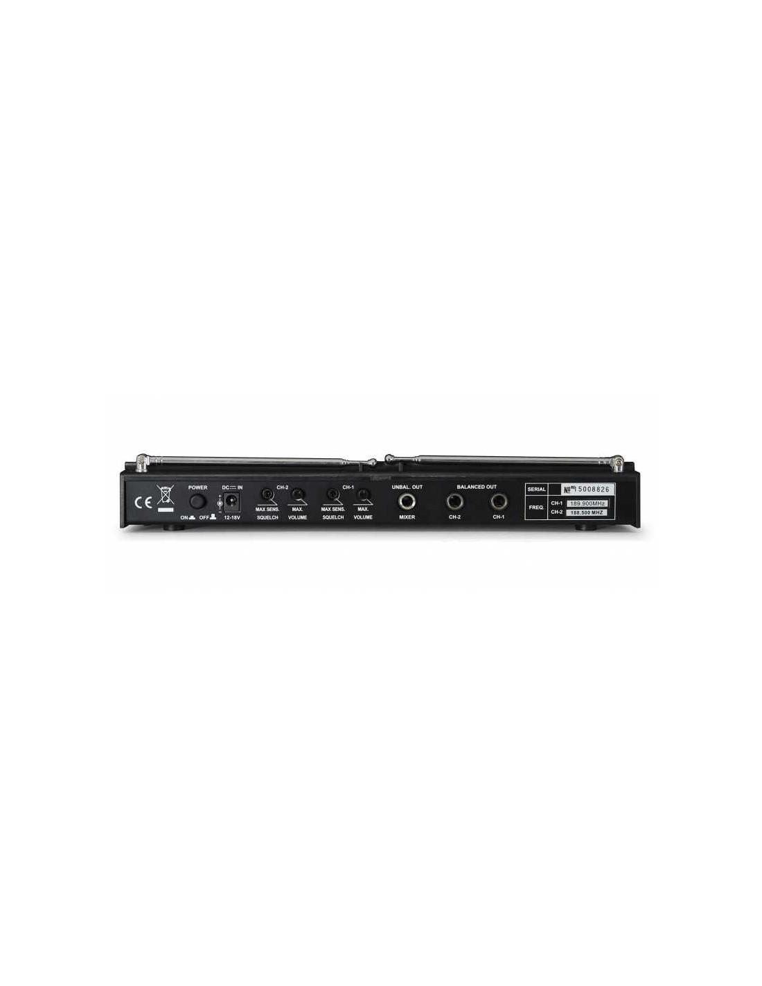 CARACTERÍSTICAS | Receptor compacto VHF 174 a 194 MHz. Control de frecuencia fija a cuarzo. Controles de volumen y squelch individuales por micrófono. Salidas individuales por micrófono y mezclada. 2 micrófonos inalámbricos de mano con cápsula dinámica unidireccional de alta calidad. | |