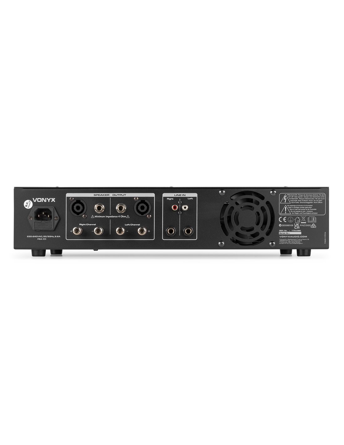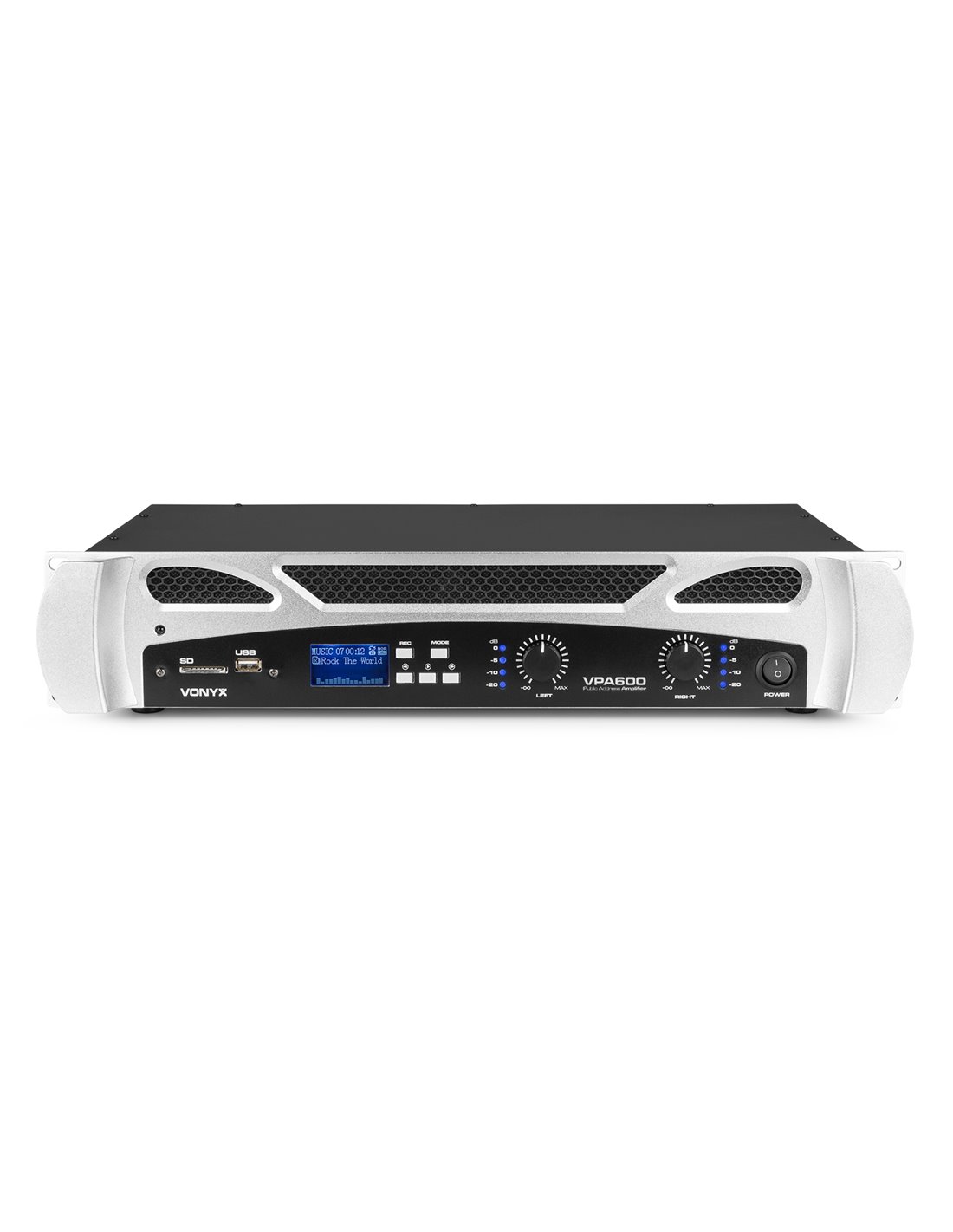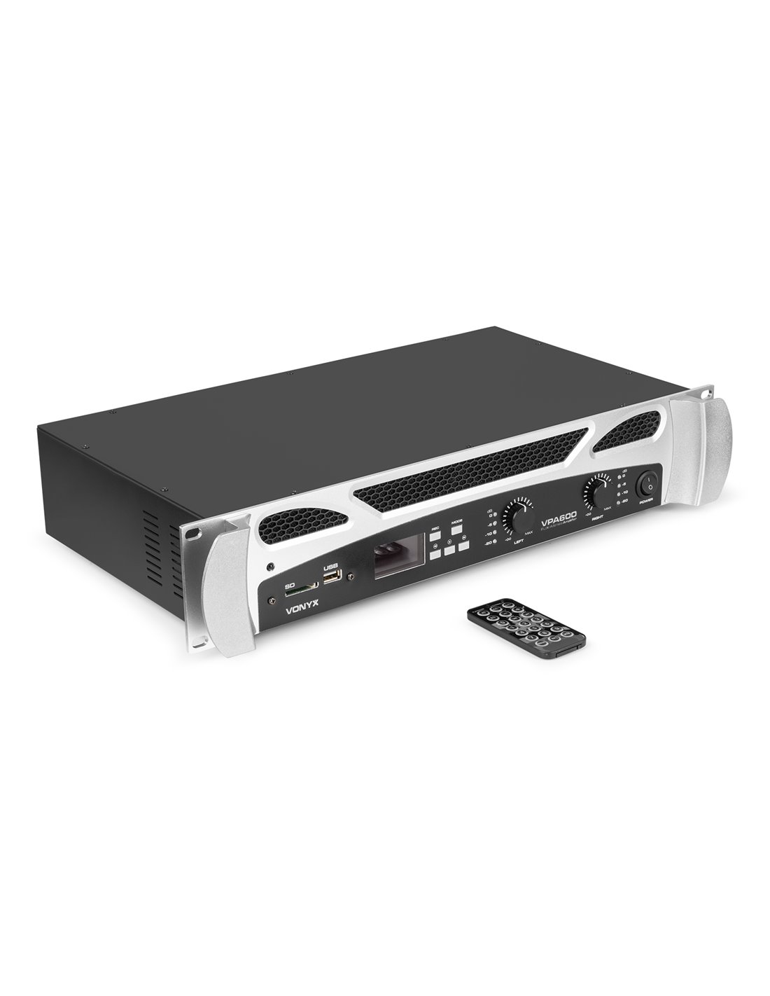 Amplificadores de gama semi-profesional. Su moderna tecnologia permite una audicion prolongada de calidad asi como facil interconexion! Como todos los amplificadores Vonyx, el VPA600 esta fabricado para soportar cualquier trabajo. Esta unidad te ofrece potencia tanto para un club lleno de gente, un escenario o para tu estudio. Permite formar parte de tu equipo en estudio o disco movil al encajar en rack estandar de 19". Amplificador estereo 2x300W Tecnolgia BT inalambrica para audio streaming Reproductor integrado MP3 por USB, SD/MMC Funcion grabacion en MP3 Entradas RCA y jack 6.3mm LED VU-meter Conectores para altavoz NL2, jack 6.3mm y terminales Caratula en aluminio con asas Enracable en 19" (2U) Mando a distancia para reproductor MP3