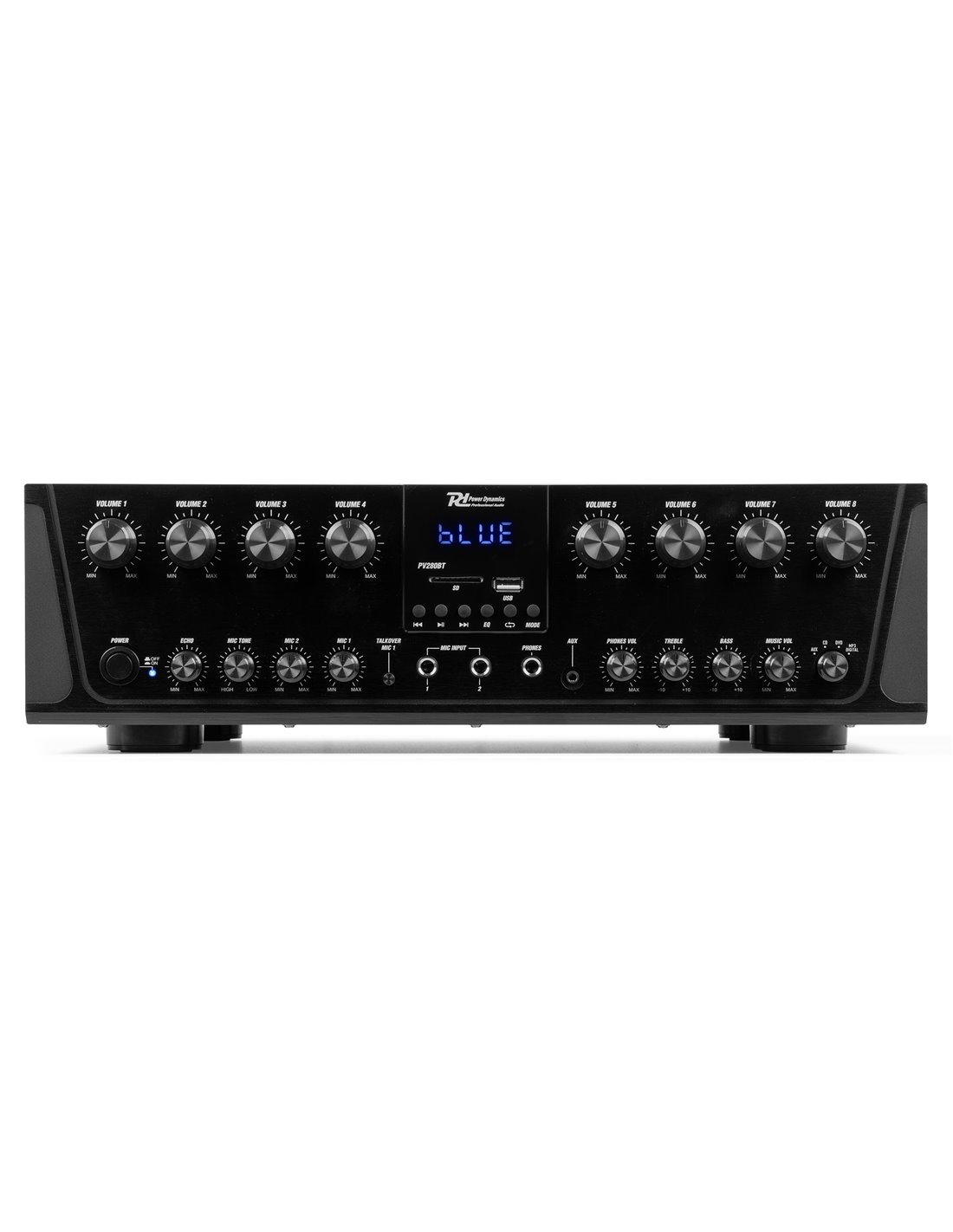 La serie PV2 son unos amplificadores inteligentes multi-canal equipados con tecnología avanzada inalámbrica BT 5.0 y funciona con cualquier dispositivo incluyendo smartphones, tablets, portátiles y ordenadores. Disfruta de un dulce sonido por streaming desde tu colección digital de música. Todos los modelos ofrecen la posibilidad de mandar música o mensajes a distintos canales deseados (Multiroom) con volumen independiente en cada uno de ellos. Incluye USB/SD card para reproducir MP3/WMA, radio FM con display LED, y dos entradas de micrófono con ajuste de graves/agudos, por lo que este amplificador es perfecto para uso doméstico y en oficinas.