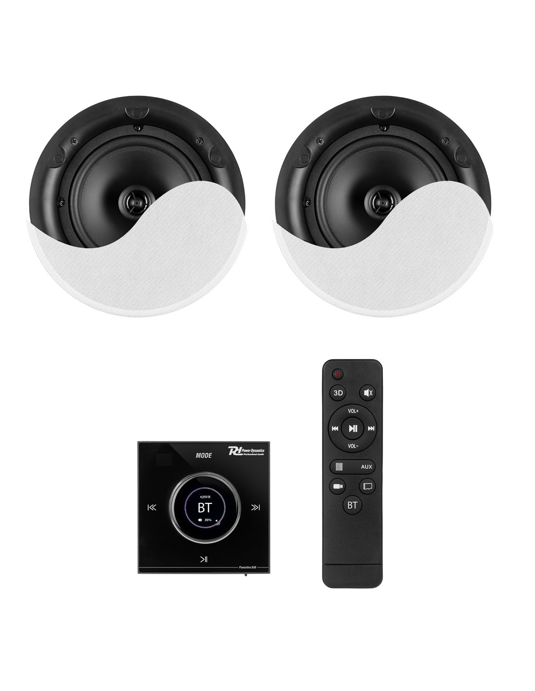 Los conjuntos Powerline consisten en un Sistema de audio para empotrar en pared con amplificador integrado, reproductor de música y altavoces de techo de perfil bajo para crear un sistema hi-fi completo. Su acabado elegante con panel sensible al tacto consigue un look minimalista para que tu sonido se oiga pero no se vea. Todos los cables y conexiones quedan seguros y escondidos dentro de las paredes y fuera de la vista para evitar toques accidentales. Disfruta tu música favorita desde varias fuentes como por ejemplo BT Streaming, USB, microSD card y entrada AUX. La función BT streaming permite conectarse directamente a tu smartphone, tableta, portátil, etc. La pantalla táctil con LCD táctil permite controlar todos los aspectos del Sistema con un simple toque de dedo. También se incluye un mando a distancia. Los altavoces incluidos de alta calidad en 2 vías incorporan rejilla metálica (de cierre magnético) y filtro crossover interno. Ideal para usar en salones, terrazas, garajes, showroom, restaurantes etcetera.