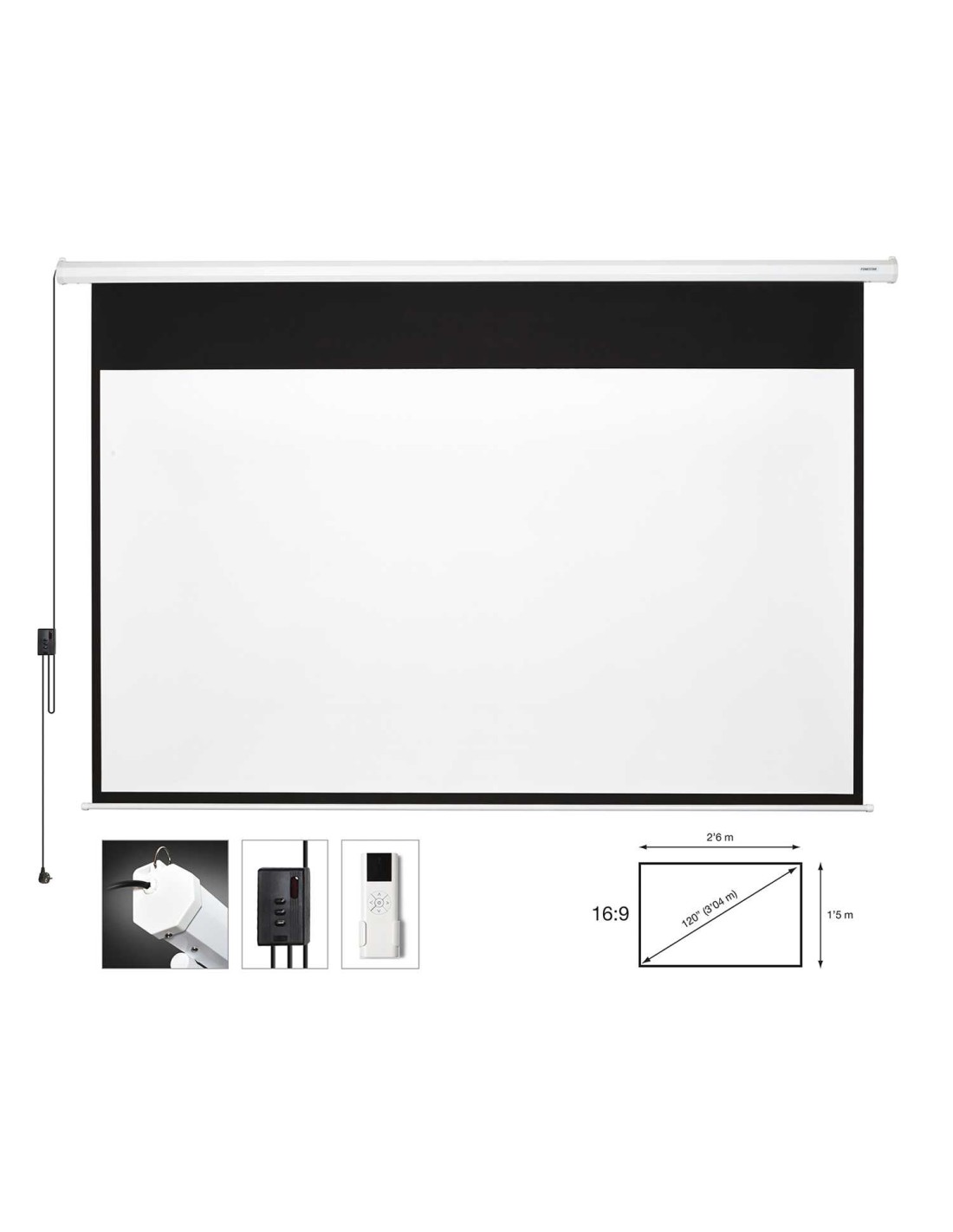 MEDIDAS | Pantalla: 120" (2'6 x 1'5 m) Recogida: 295 x 11 x 8 cm fondo | |