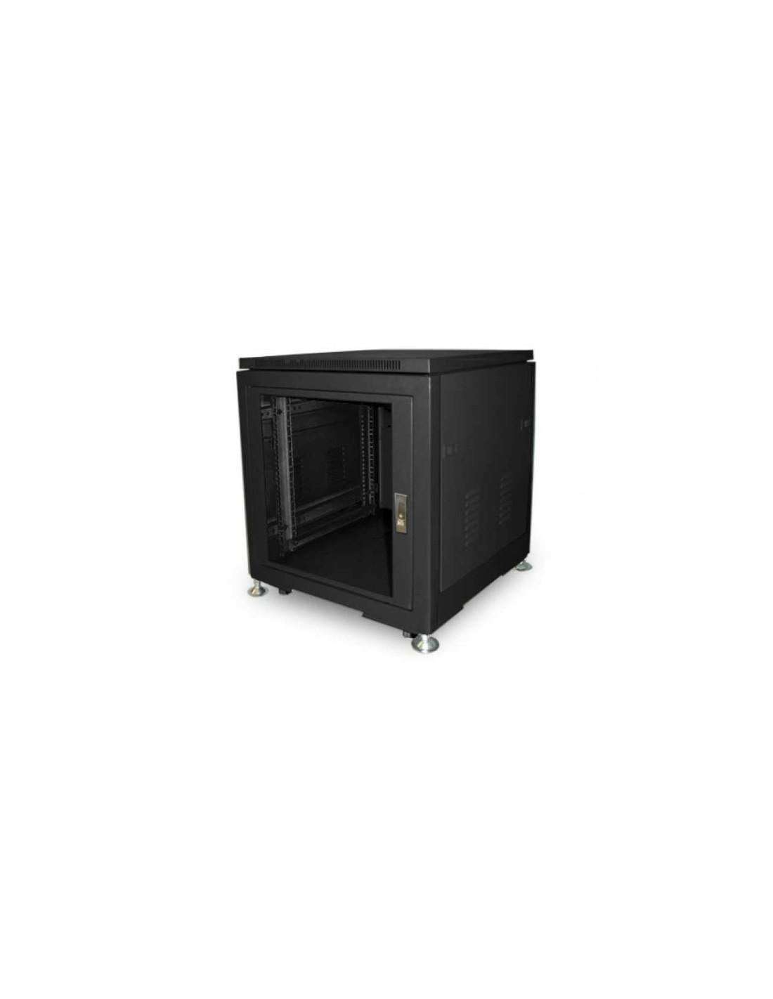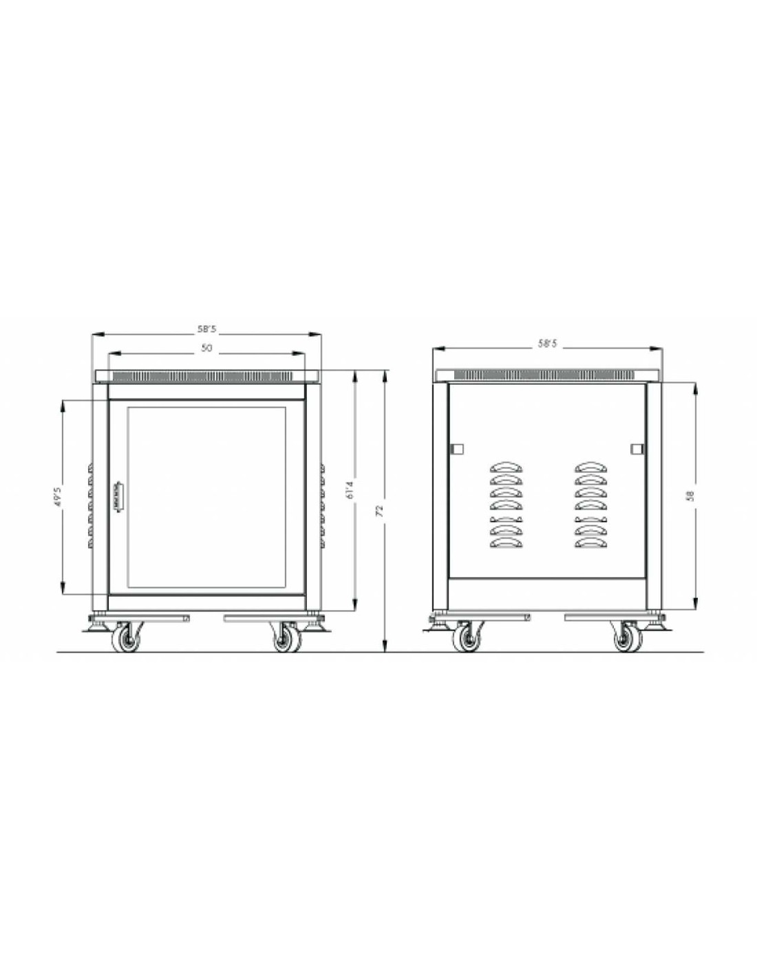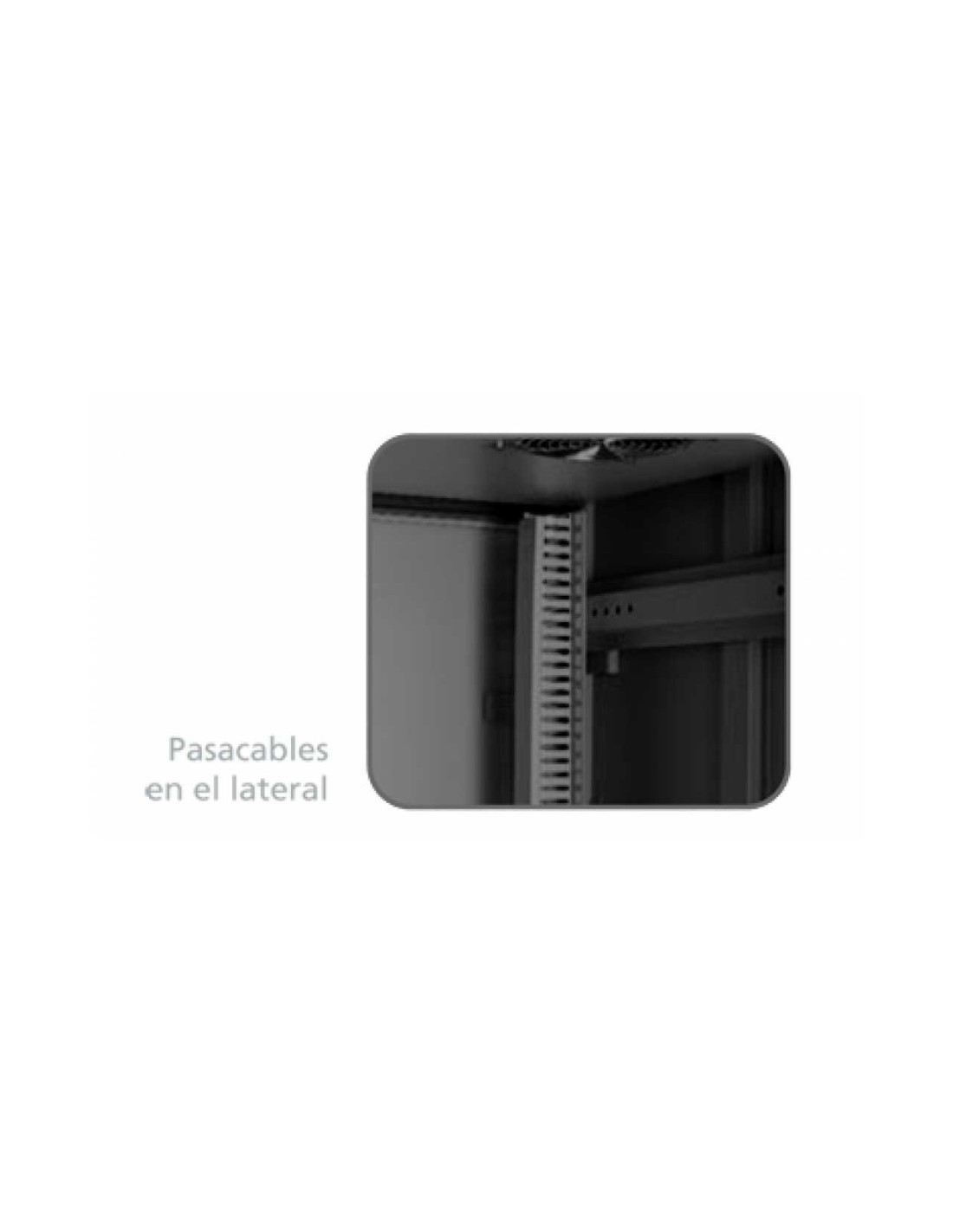 CARACTERÍSTICAS | Armario rack 19'' metálico, puerta de metacrilato transparente con cierre y llave, ruedas con freno, patas y 2 ventiladores (230 V CA) en el techo. Paneles laterales y posterior desmontables. Pasacables en el lateral. Acabado esmaltado negro. | |
