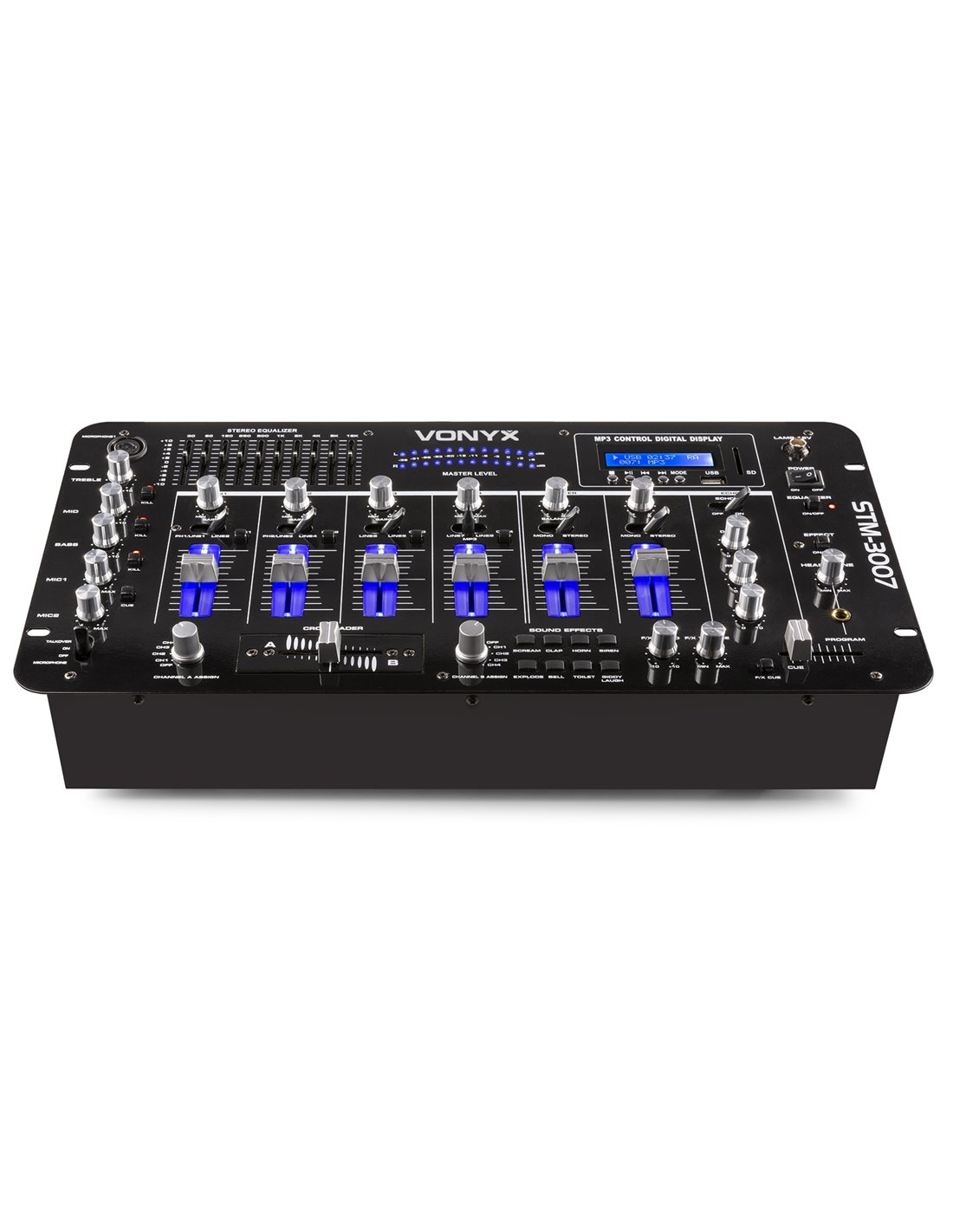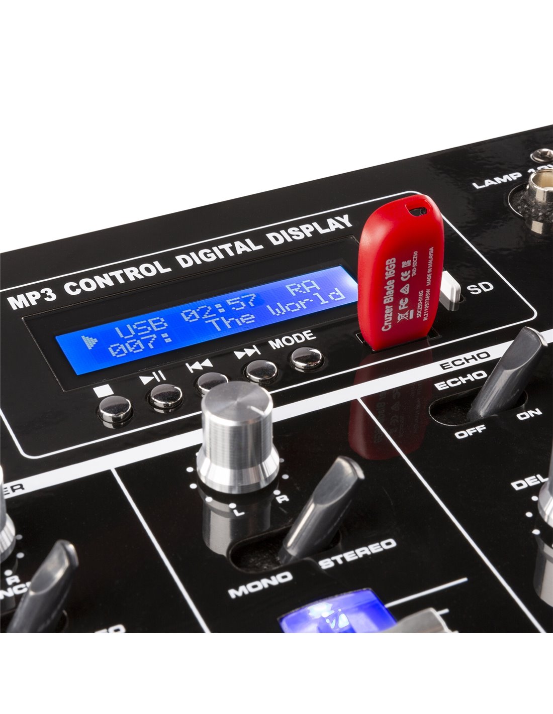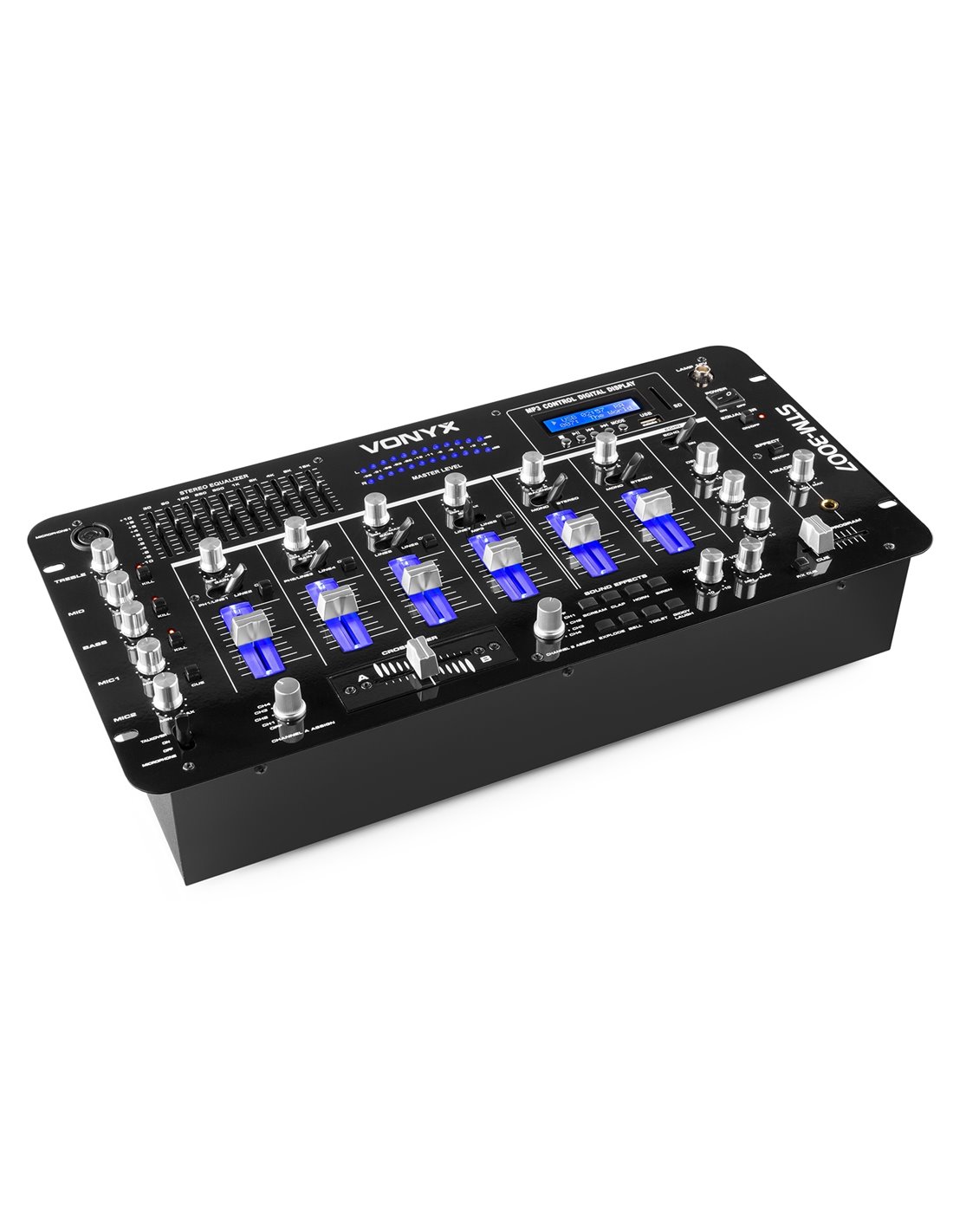 Mezclador versatil 6-canales enracable 19" profesional con reproductor MP3 con BT para transmitir el audio a la mezcladora. También cuenta con canales de fader iluminados, 10-Bandas grafico EQ estereo, microfono con ecualizador y talkover, Efectos de sonido, auriculares en cada canal para monitorizar y muchas otras caracteristicas. Ideal para disco, club, bar, y home studio etc.
