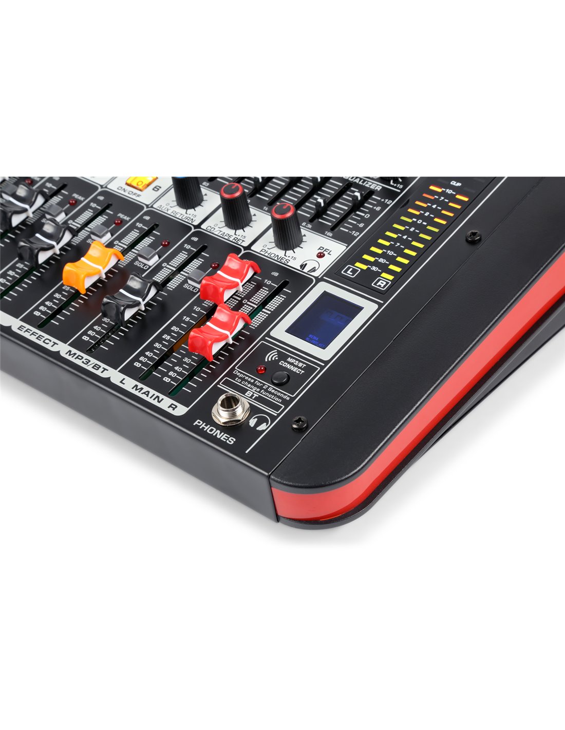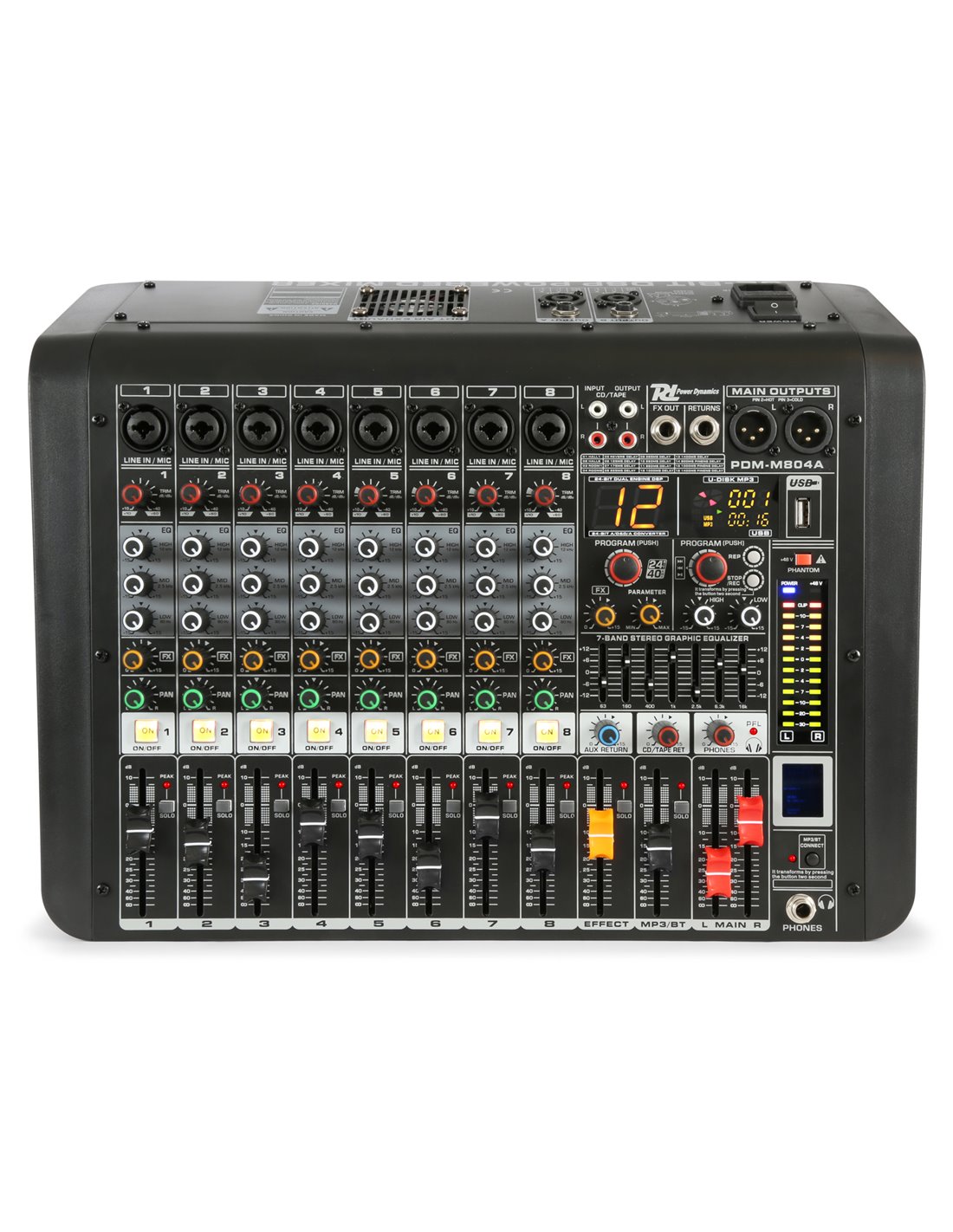 Mezclador de directo de sobremesa con amplificador integrado y funciones muy atractivas. Incluye mute y solo en cada canal, reproductor por USB con display digital y receptor BT para audio streaming durante las pausas. Ideal para directos y pequeños grupos.