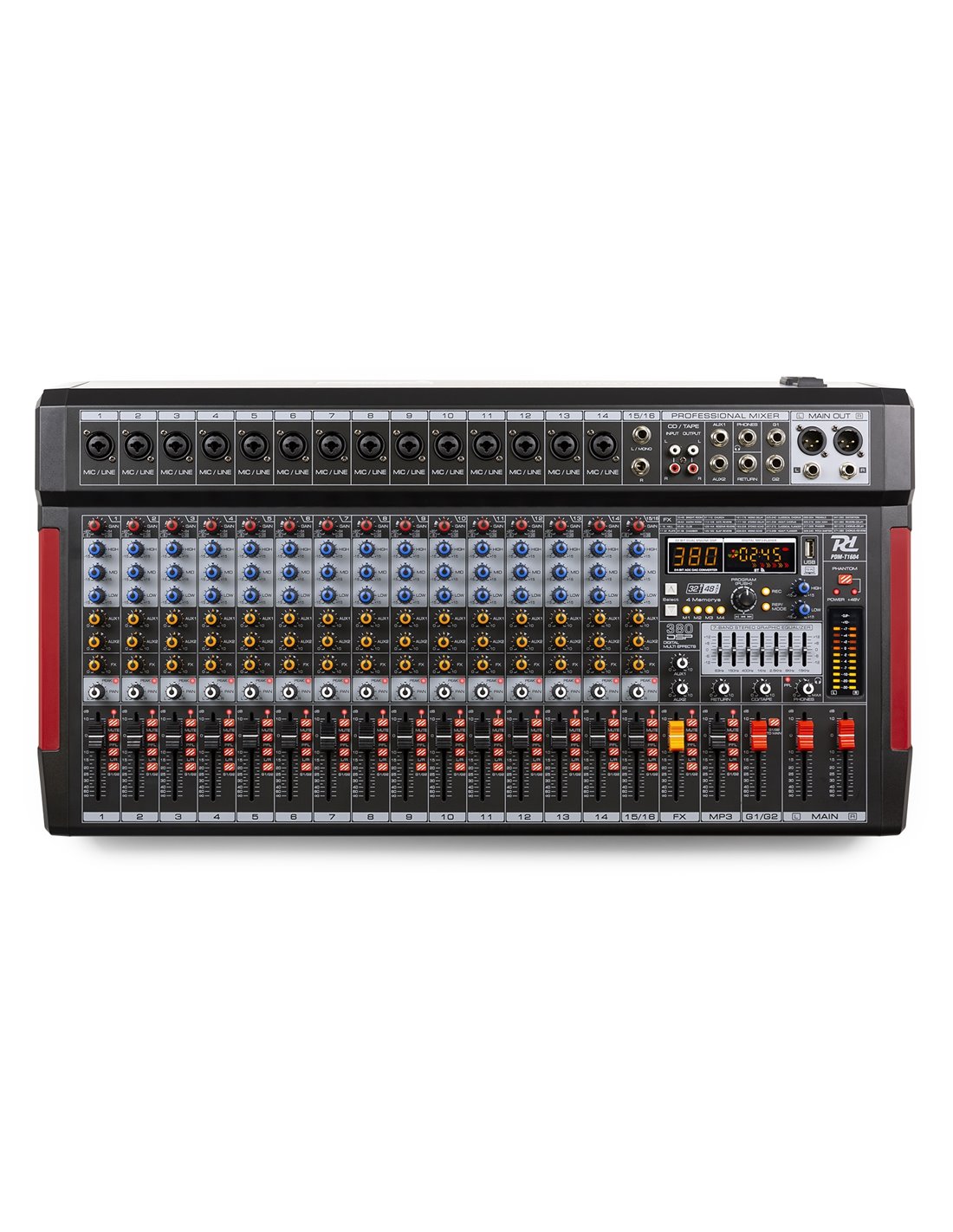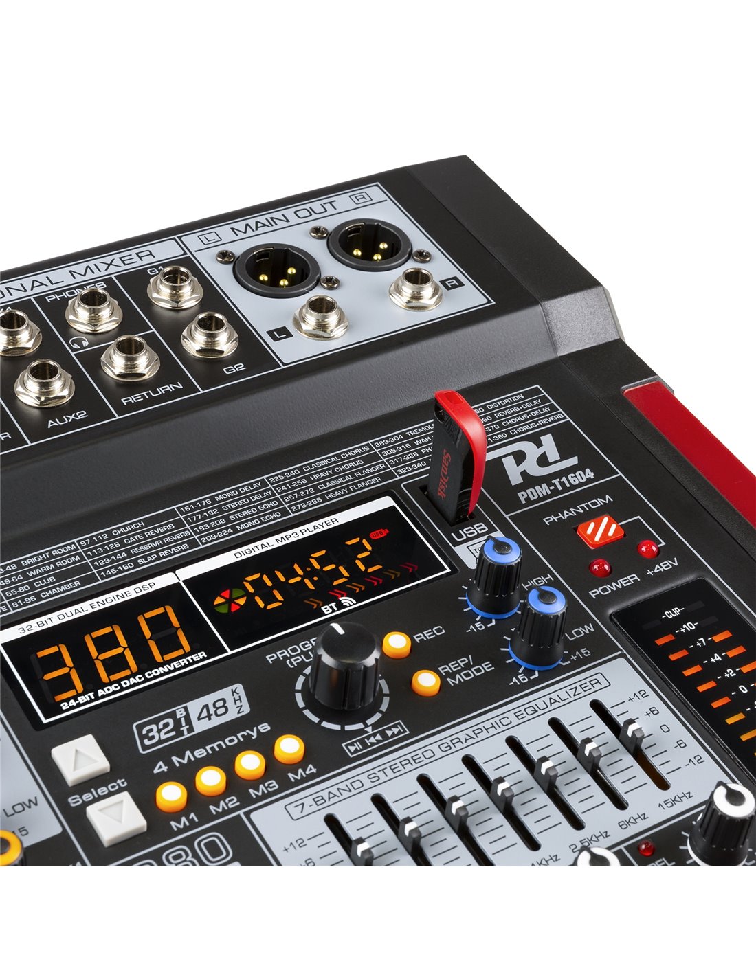 La serie PDM-T es una serie de mezcladores de escenario equipados con un procesador de efectos DSP de 32 bits, ecualizador gráfico estéreo de 7 bandas, capacidad de transmisión BT y entrada/salida USB para una fácil conexión al ordenador para grabación de música, etc. También es posible utilizar la función de grabación con un solo clic para grabar fácilmente MP3 en una memoria USB. Cada canal tiene su propio control de ganancia con controles de agudos, medios y graves. Los preamplificadores de micrófono ofrecen alimentación phantom seleccionable de 48 V en todos los canales de micrófono. Los mezcladores PDM-T están diseñados para proporcionar capacidades de mezcla multicanal para bandas, músicos, ingenieros de sonido, conferencias, grabación en estudio y una variedad de otras aplicaciones de escenario en vivo.