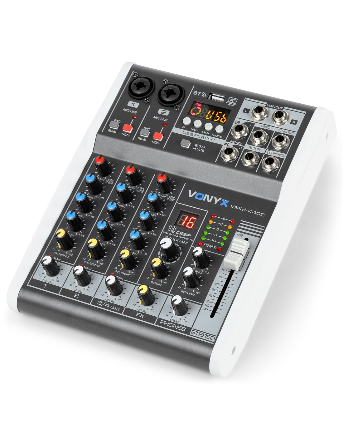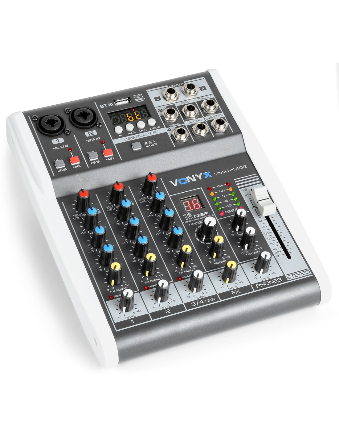 Mezclador de directo facil de usar y a un precio razonable. Control de agudos, medios y graves por canal. Alimentacion phantom individual por canal haciendo de esta unidad perfecta para directo y estudio de grabacion.