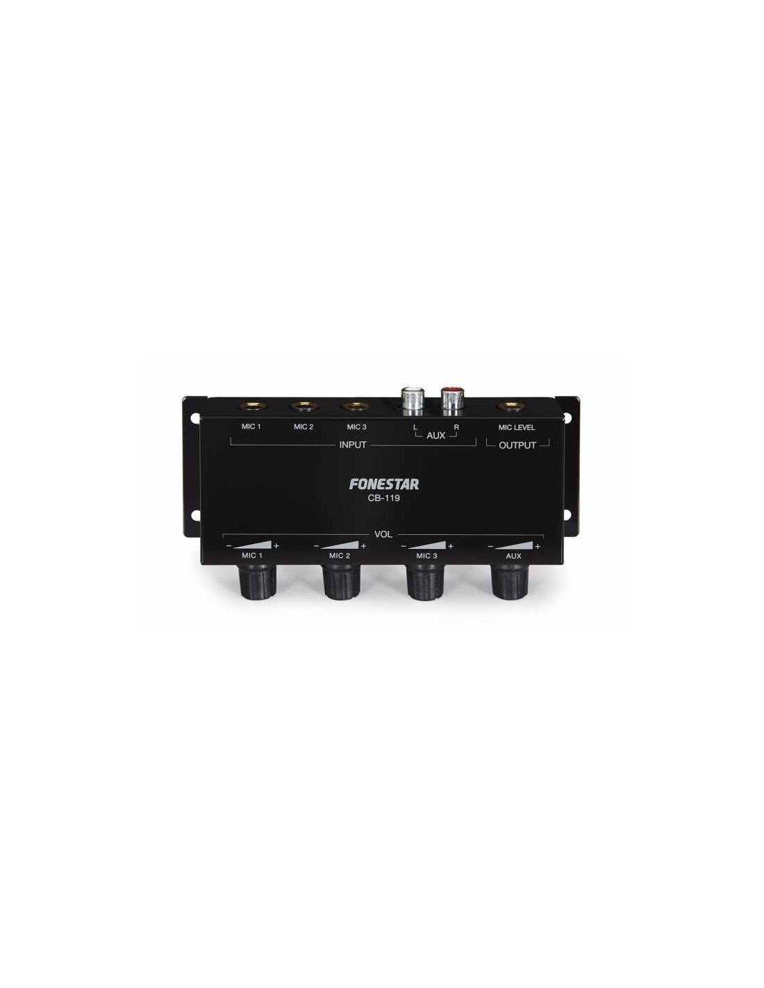 CARACTERÍSTICAS | Mezclador pasivo de 3 micrófonos y 1 entrada auxiliar. Salida de nivel de micro para conexión a 1 entrada de micrófono. | |