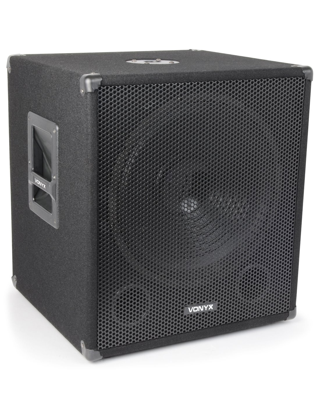 Subwoofer con woofers 15" de alta potencia con parámetros atractivos y un filtro incorporado de paso bajo. Recubiertos de moqueta negra que actua de amortiguador. Los bafles están equipados con asas de transporte y un vaso para montaje en soporte. Conexión de cables por conectores chapados en oro o base jack 6.3mm.