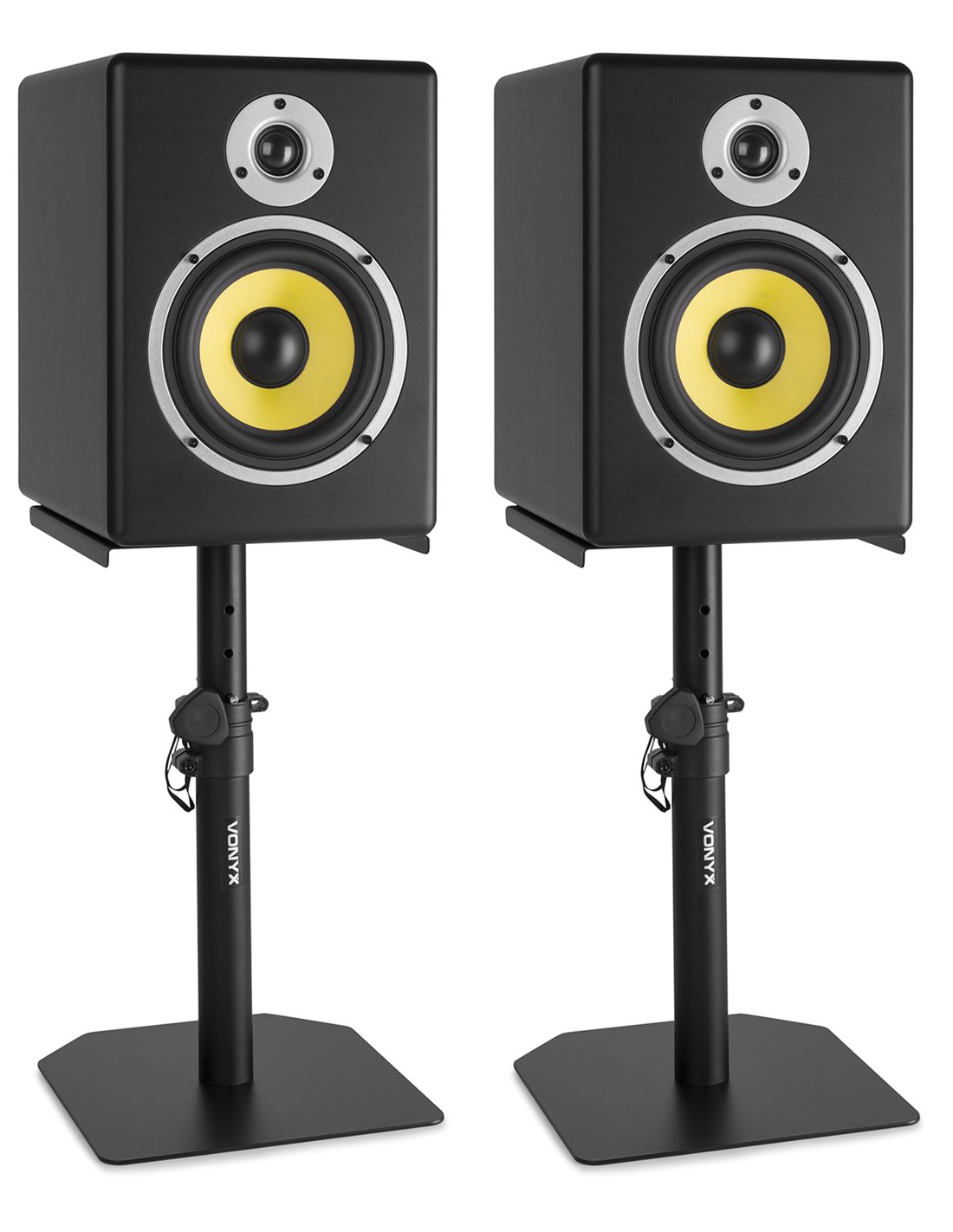 Soporte ajustable para monitor de estudio de hasta 8 pulgadas. Los soportes se ajustan en altura de 34cm hasta 49cm. Incluye 8 capsulas anti-vibracion y tiras de goma para enganchar y evitar desplazamientos.