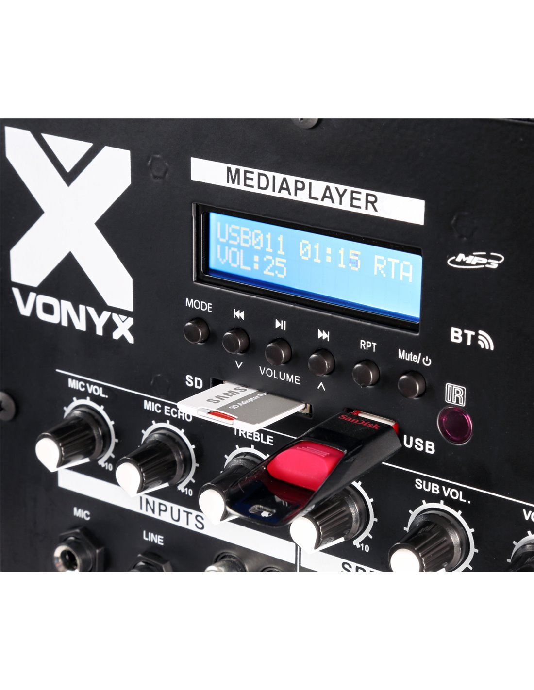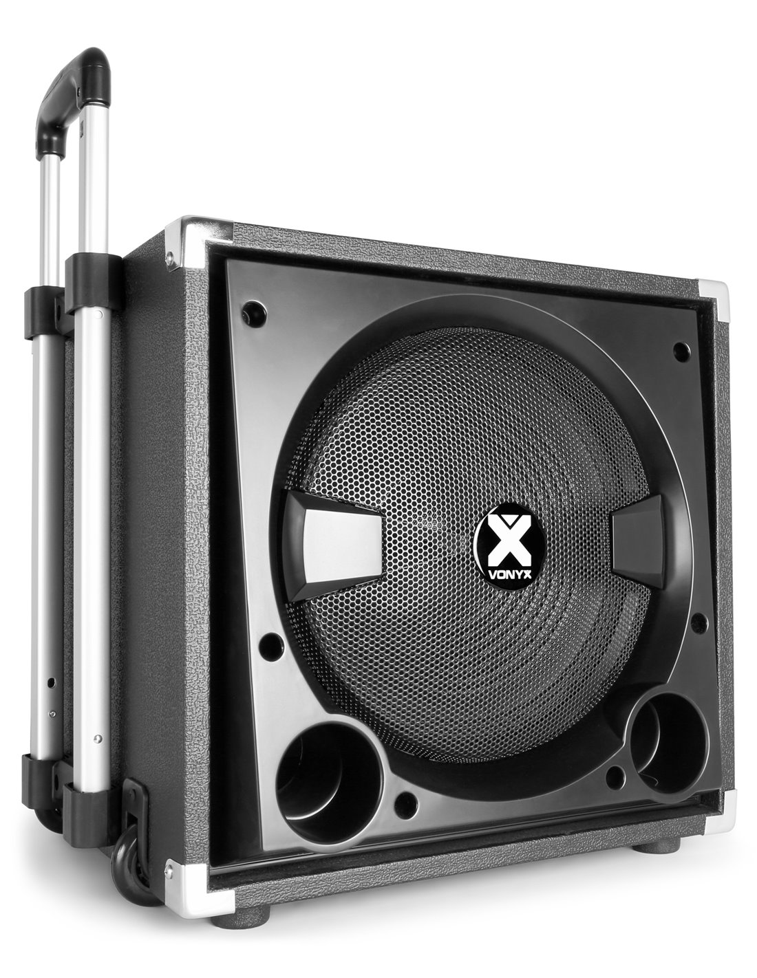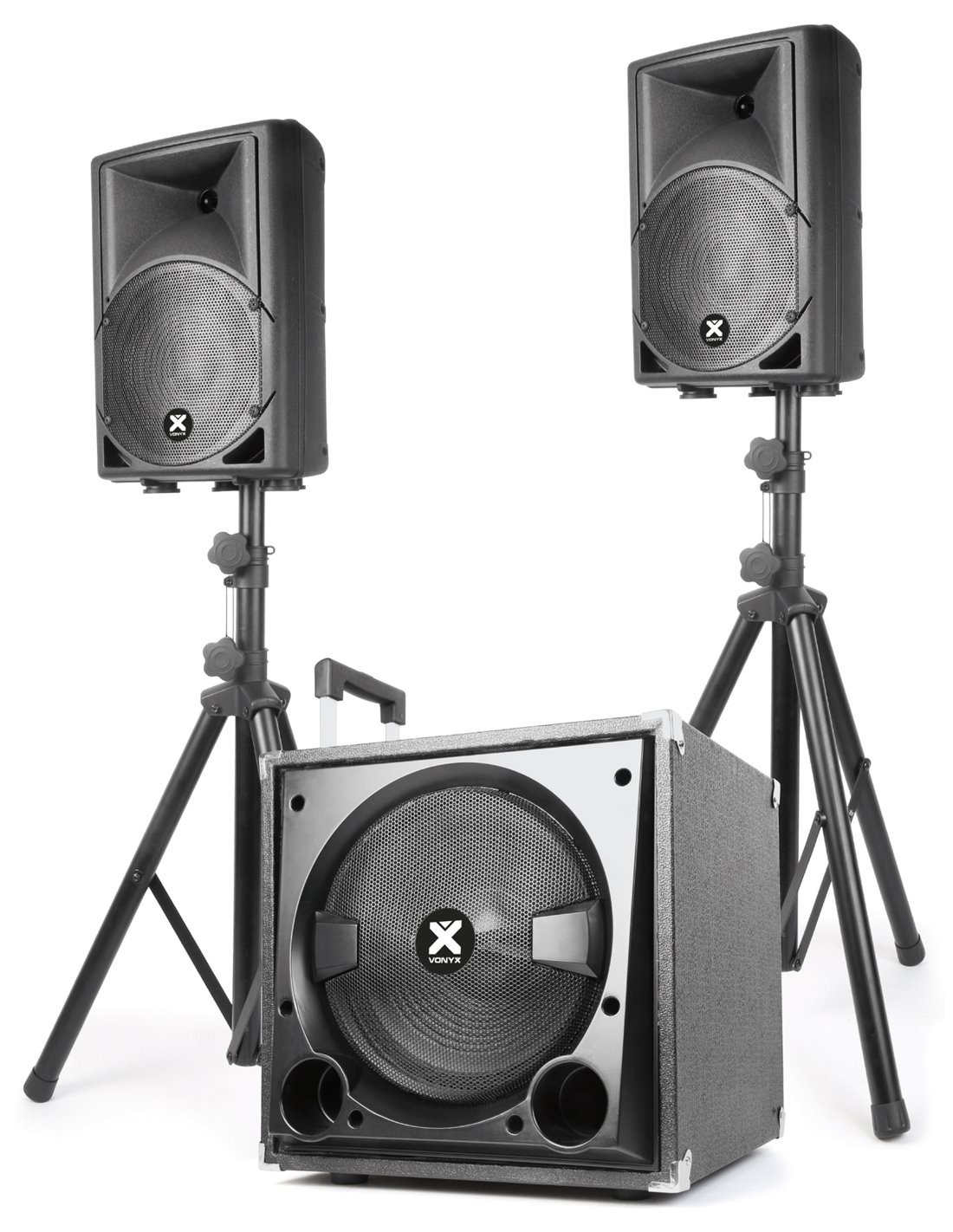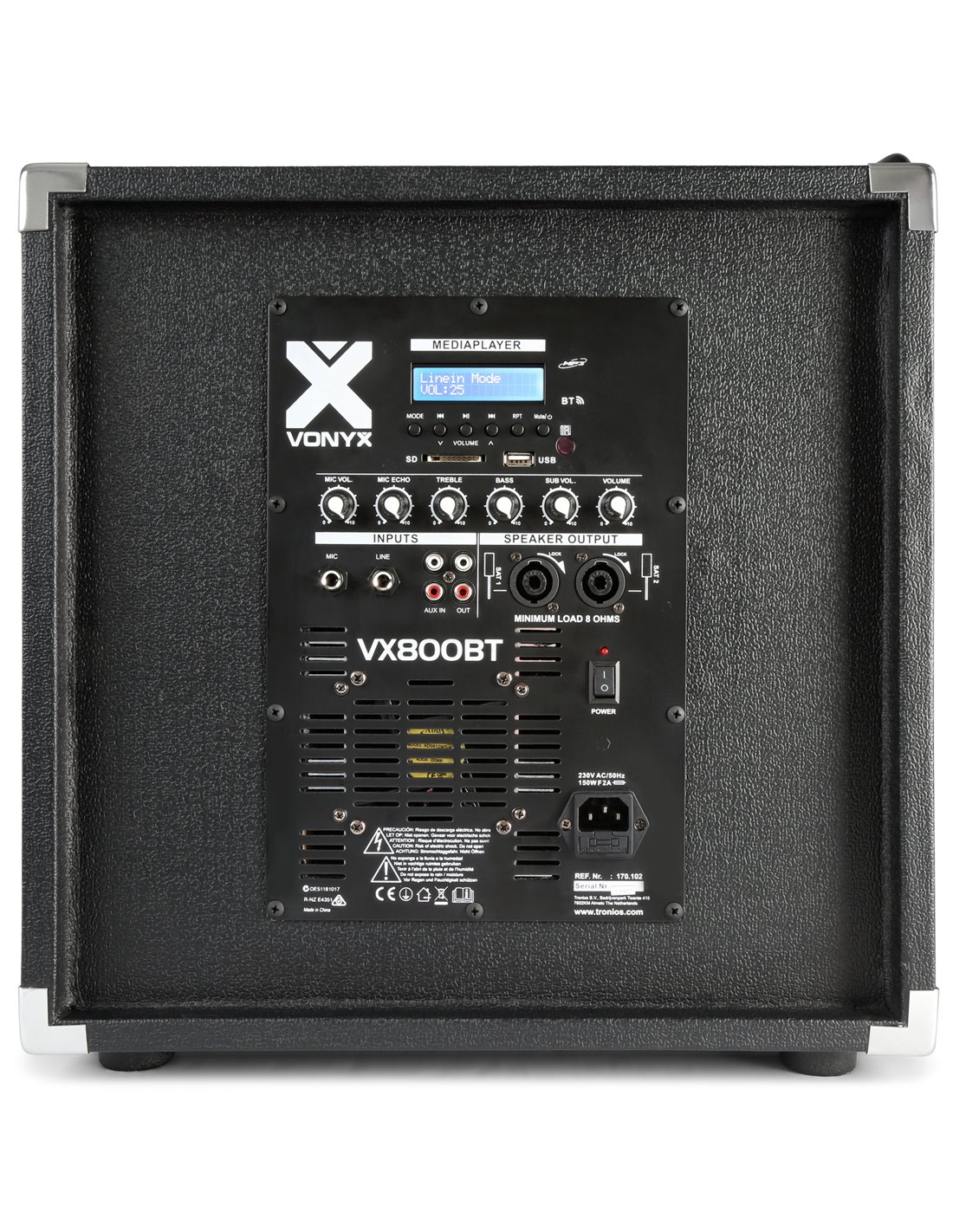 El VX800BT 2.1 conjunto de altavoces activos es fácil de instalar y fácil de transportar. Este conjunto incluye un subwoofer de 12” y dos altavoces de 8” con un motor dinamico de 1”. El receptor BT incorporado le permite transmitir su música de forma inalámbrica desde su smartphone o también puede utilizar la función de reproductor de MP3 con las ranuras USB y SD. Este juego de altavoces activo es adecuado para discotecas móviles, programas de karaoke, espectáculos, presentaciones, etcétera.