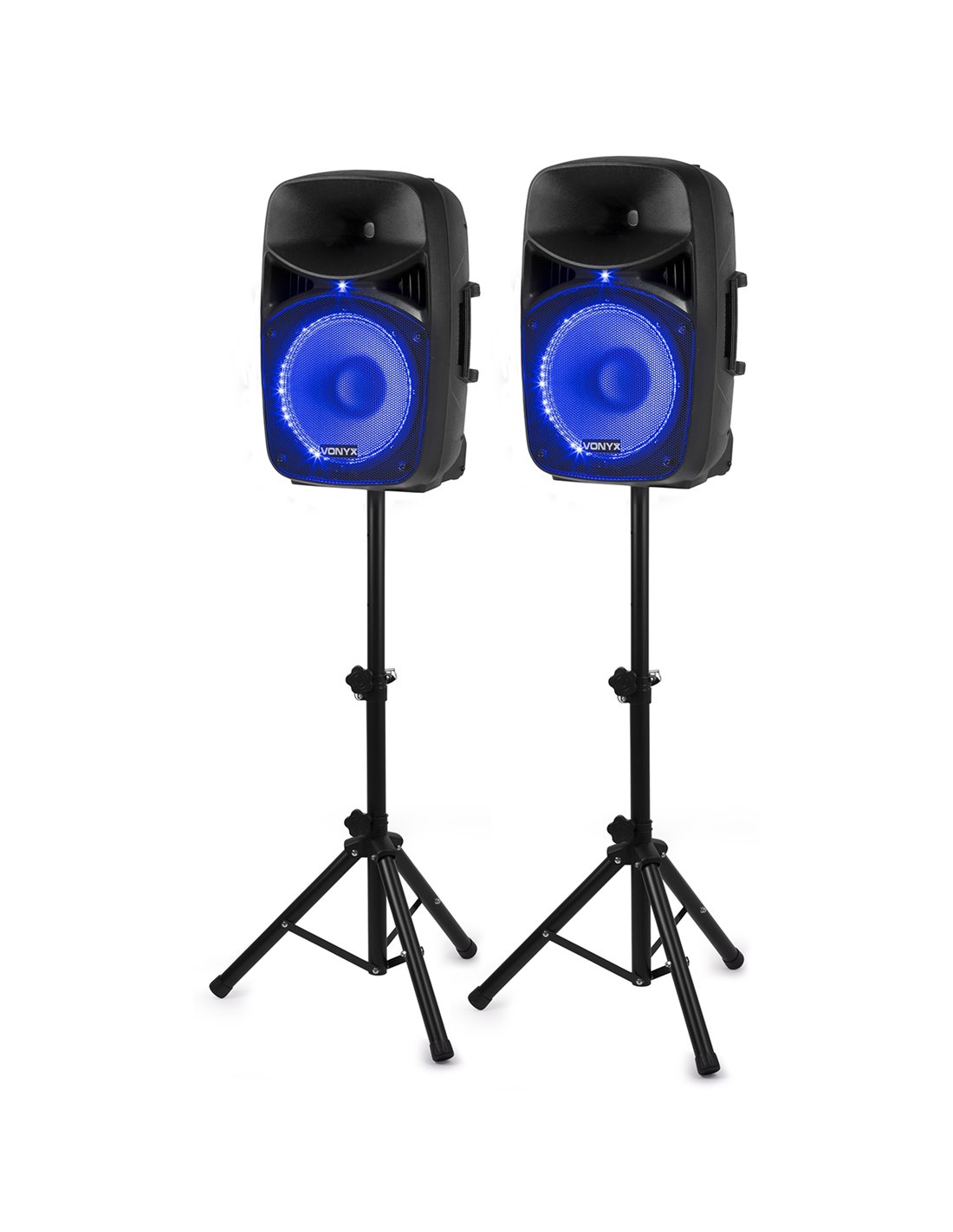 El VPS122A es un set completo plug & play, listo para empezar tu fiesta. El set contiene una pareja de bafles 12" uno activo y otro pasivo. En los modelos activos, el amplificador integrado incorpora reproductor USB/SD para ficheros MP3 y receptor BT para audio streaming de tu música desde Smartphone o tabet. Ambos altavoces incorporan un aro de LED azul para dar color al woofer y iluminar tu fiesta. Completando este kit se entrega con tripodes y micro de cable para eventos de karaoke o presentaciones.