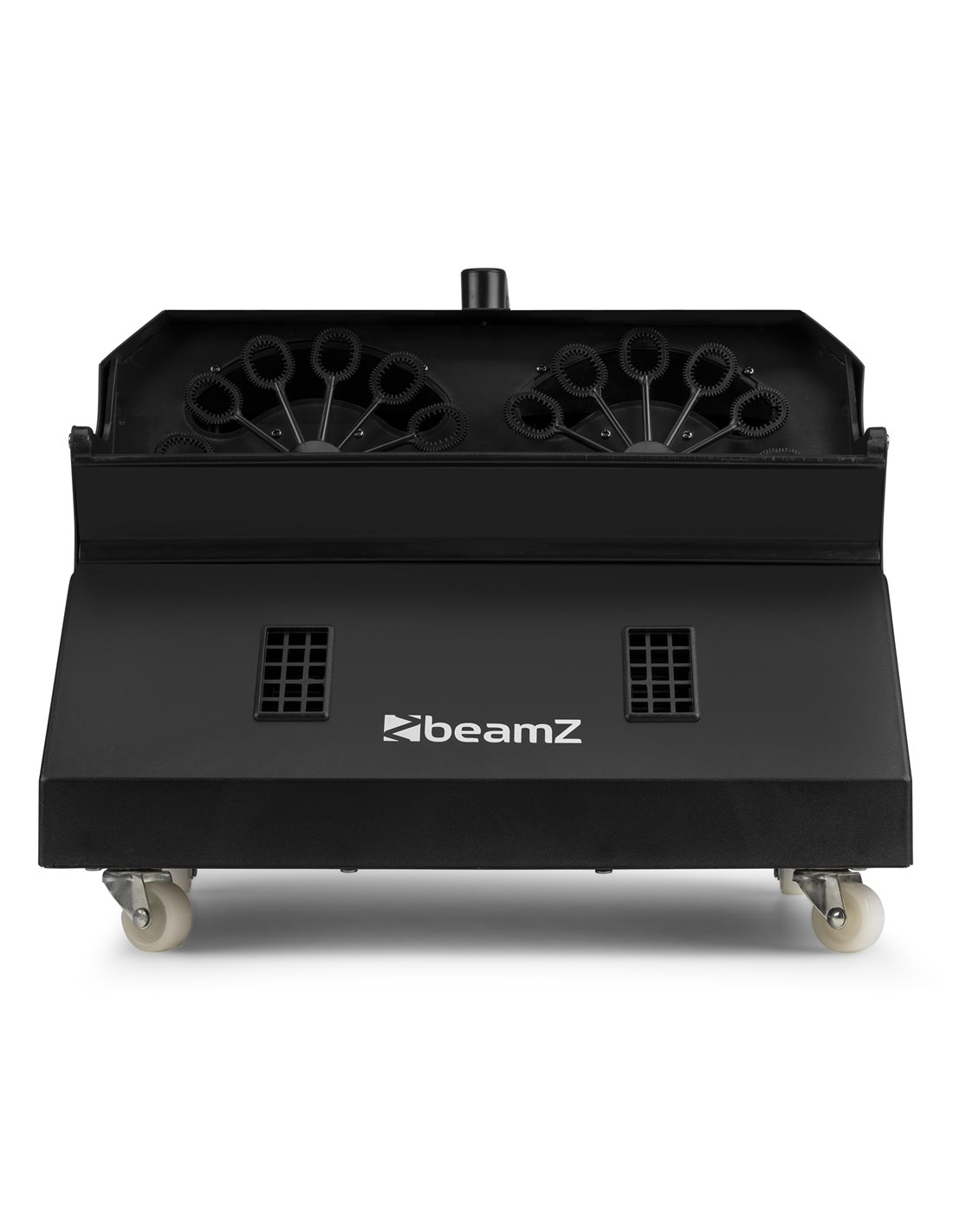 Maquina de burbujas doble con doble rueda para mayor produccion de burbujas y mejorar la dispersion del efecto. La maquina crea millones de burbujas de colores.