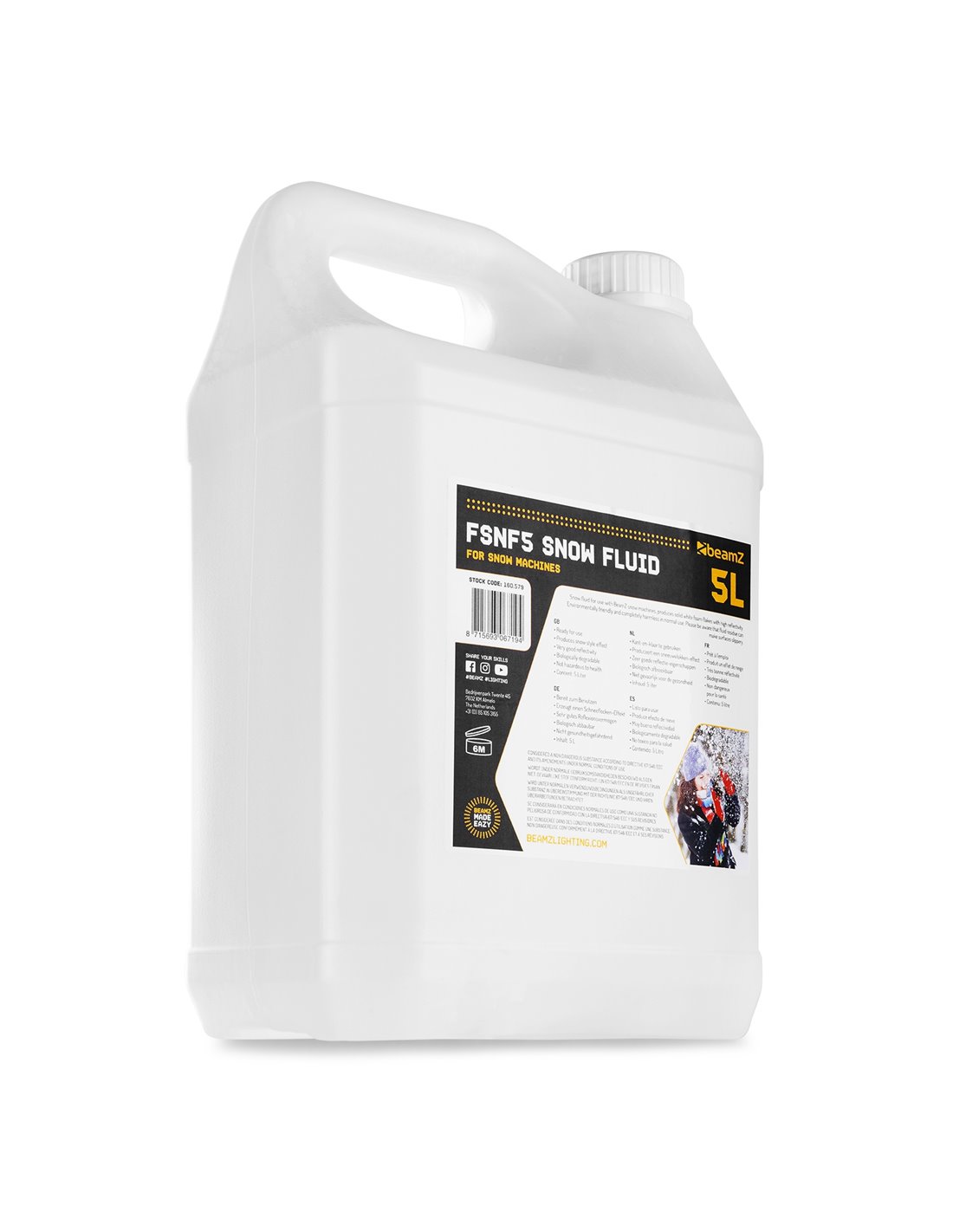 Liquido de nieve para usar en las máquinas de nieve de BeamZ, para conseguir copos de nieve blancos de buena reflectividad. Respetuoso con el medio ambiente y completamente inocuo en su uso normal. Tome nota que el residuo en el suelo puede ser resbaladizo.