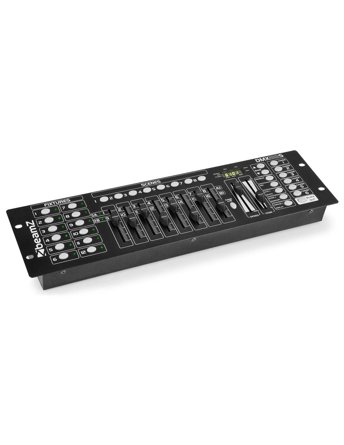 Controlador `para varias unidades DMX. Incorpora 30 bancos de memoria para hasta 240 escenas. Los programas pueden activarse por sonido, auto, manual y via midi. Un display de LED avisa del black out, pasos, programacion, ajustes de musica y automatico.