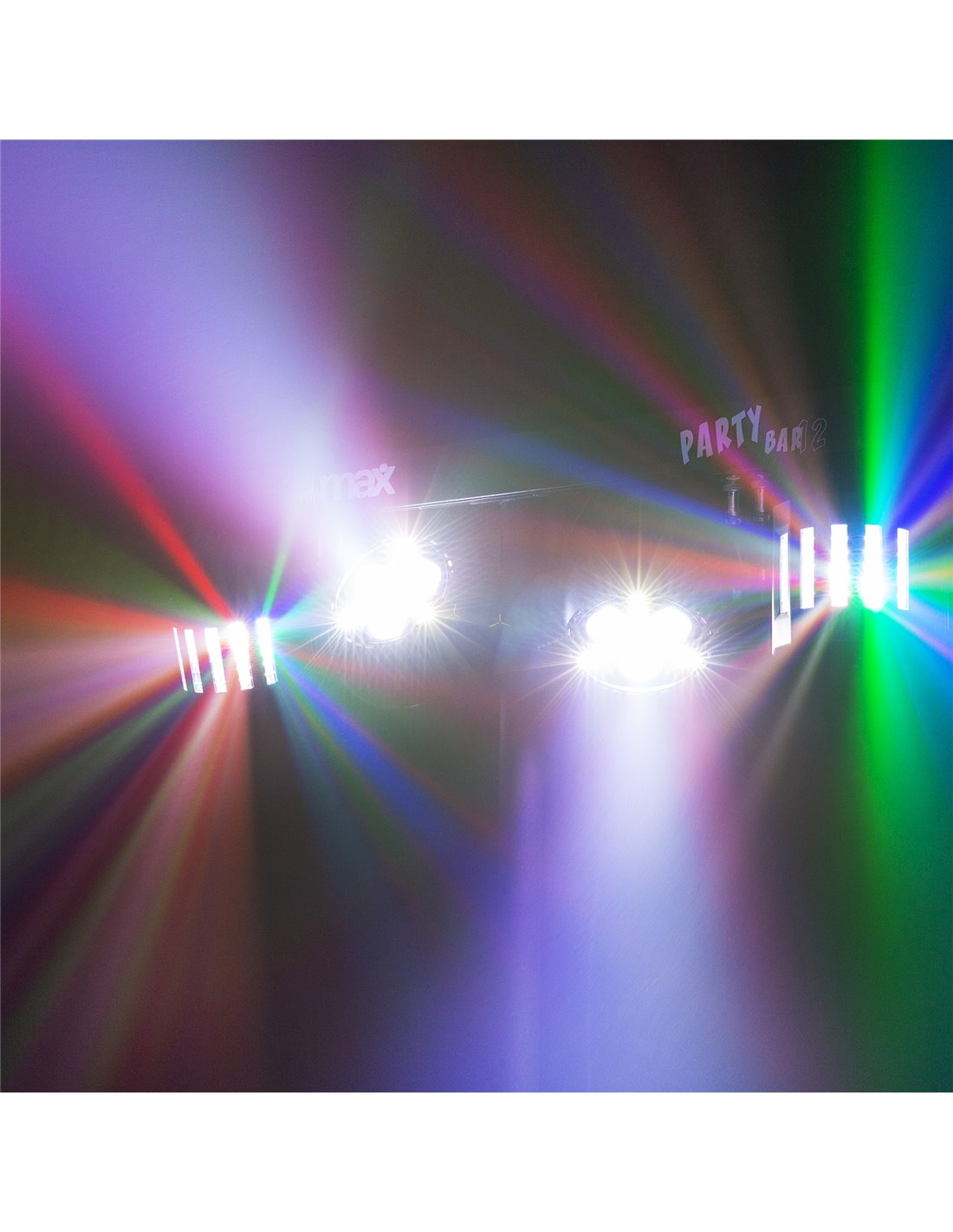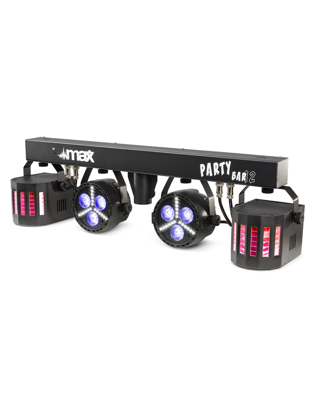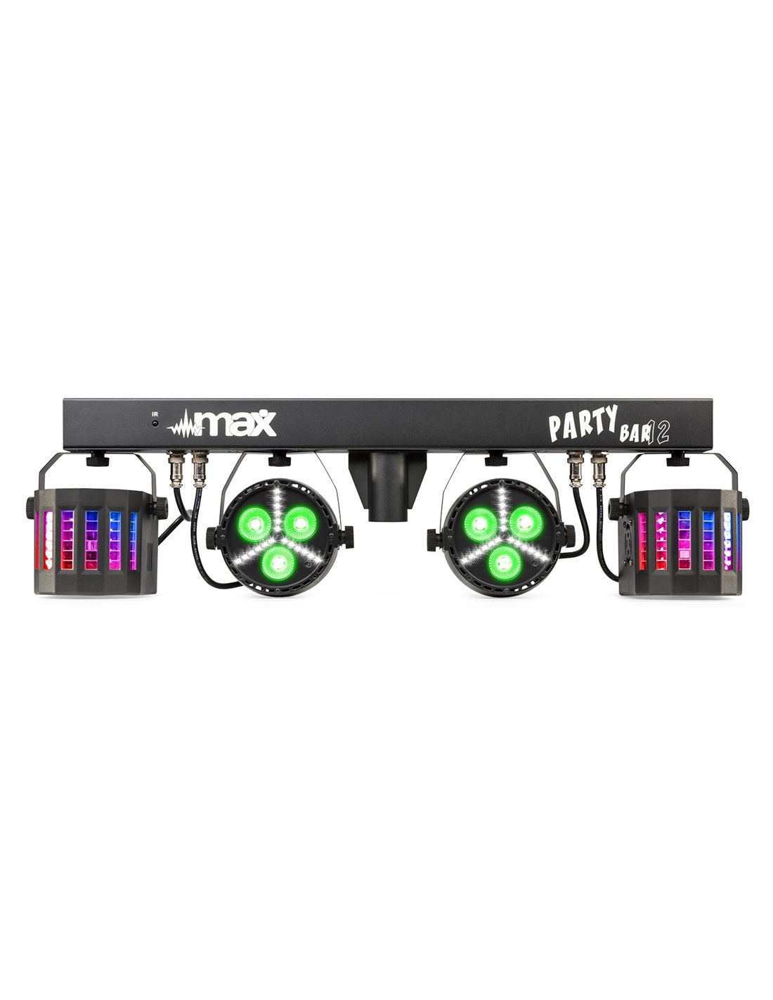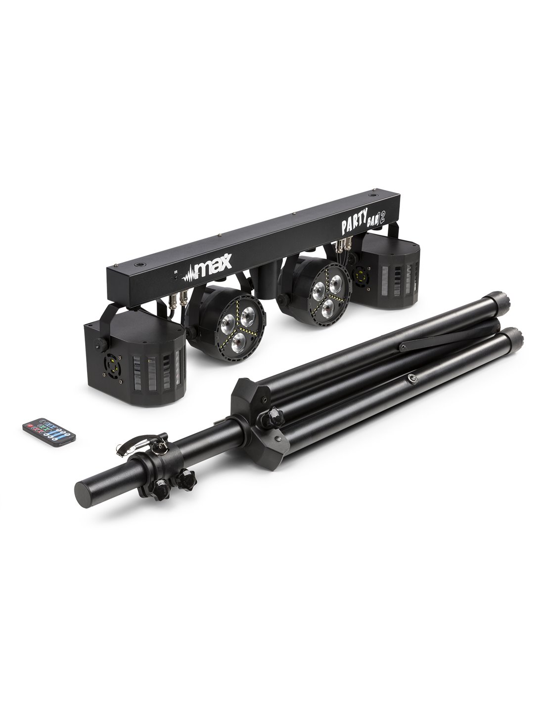 La serie MAX PartyBar consiste en varios kits completos que incluyen efectos de luz LED espectaculares. Todos los kits incluyen LEDs de alta intensidad en varios colores. Esta serie de Party Bars es “plug and play” y puede controlarse vía DMX, mando a distancia IR o auto y ritmo de la música con programas seleccionables desde el panel display LED con botones. Un trípode especial está incluido para poder colocarlo fácil y rápidamente. Especialmente diseñado para escenario, fiestas, animadores y otros eventos.