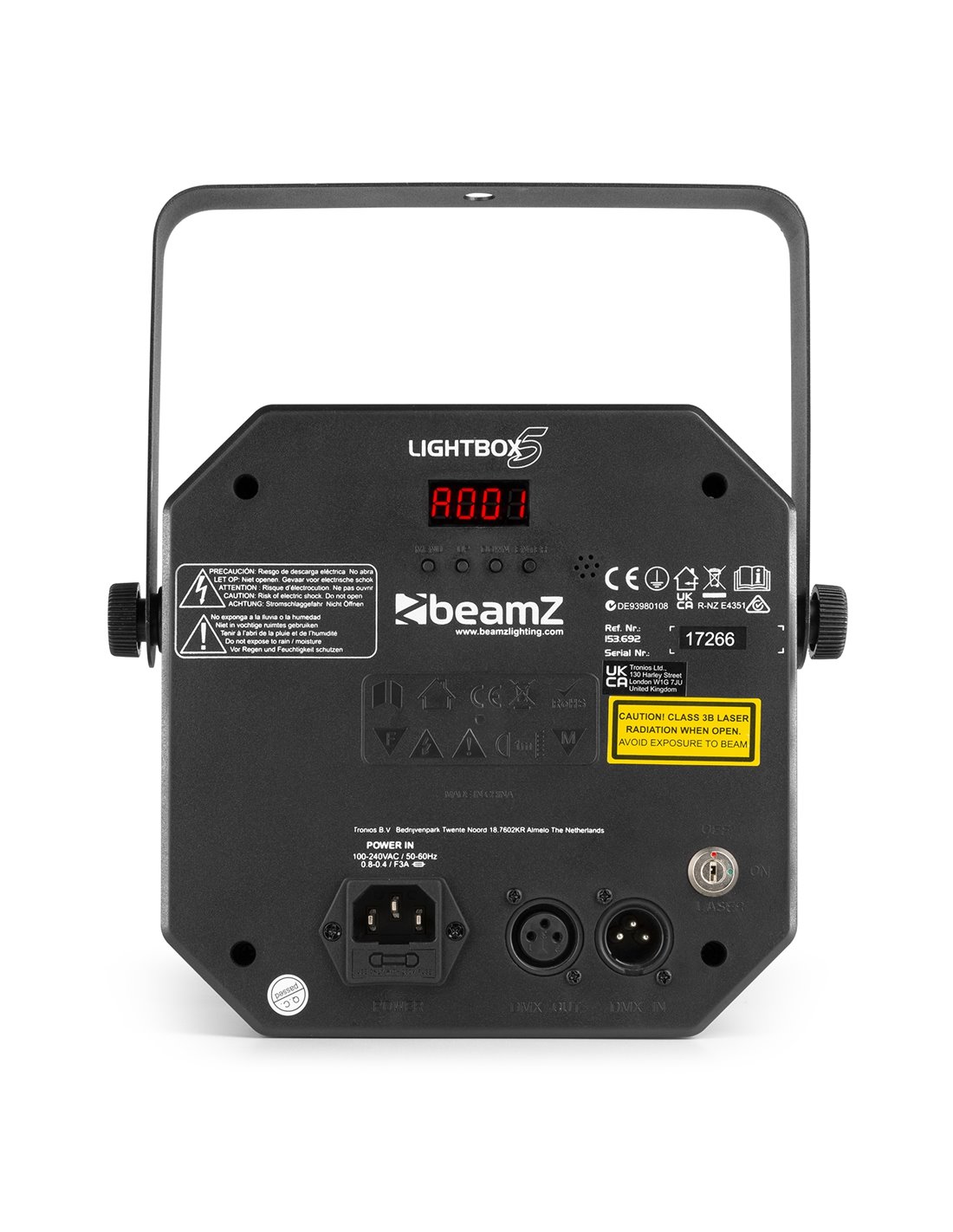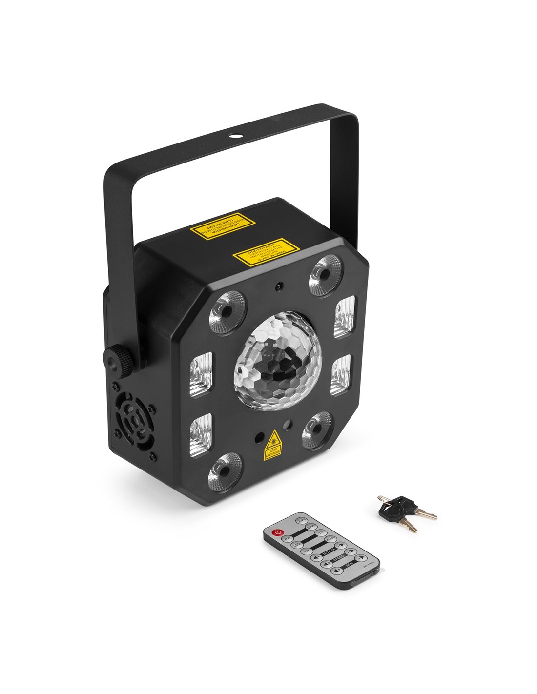 El LightBox5 combina la potencia de 5 efectos muy populares en una sola unidad. ¡Una sola unidad para una fiesta completa! La combinación de un laser Rojo/Verde, con los rayos rotativos de color de una jelly ball, la luz negra UV y un foco PAR garantizan una fiesta completa. Los efectos funcionan con show preprogramado con ritmo de la música. Y si quieres efectos más dinámicos puedes utilizar el control por DMX de 18 canales que te permite controlar cada efecto, haciéndolo útil para show y eventos.