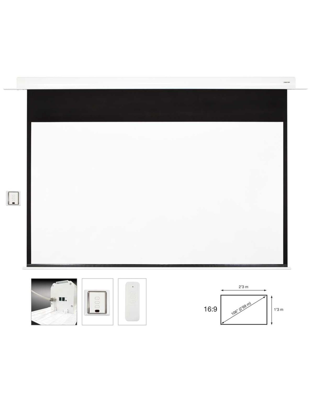 MEDIDAS | Pantalla: 106" (2'3 x 1'3 m) Recogida: 262 x 12'5 x 11 cm fondo Panel de ocultamiento: 284 x 17 cm | |