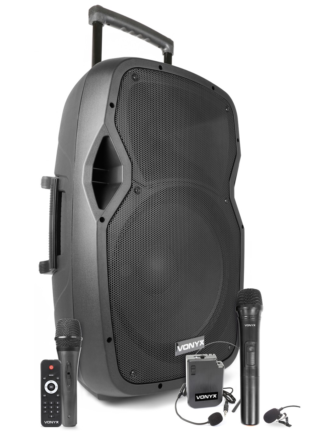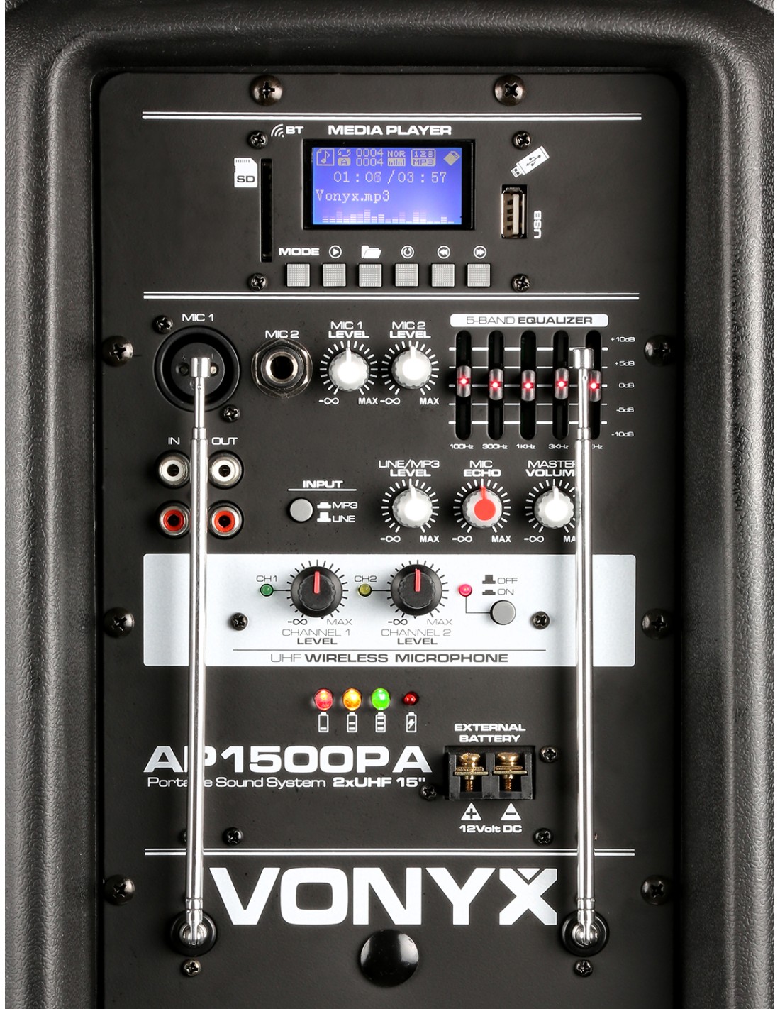 Bafle portatil PA profesional 15" 800W con mando a distancia, puerto USB integrado y lector SD Card para reproducir ficheros MP3. Este sistema "todo en uno" viene equipado con un receptor BT para reproducir en streaming y con UHF transmisores de petaca . Se alimenta a corriente o con bateria incorporada de 12V que lo hace totalmente independiente. Incorpora asas de transporte y ruedas. En la parte trasera trae dos entradas mas para microfonos de cable con efecto echo para todos micros, entrada AUX linea, controles de tono etc. Este sistema completo es indispensable en cualquier evento donde se necesite musica..