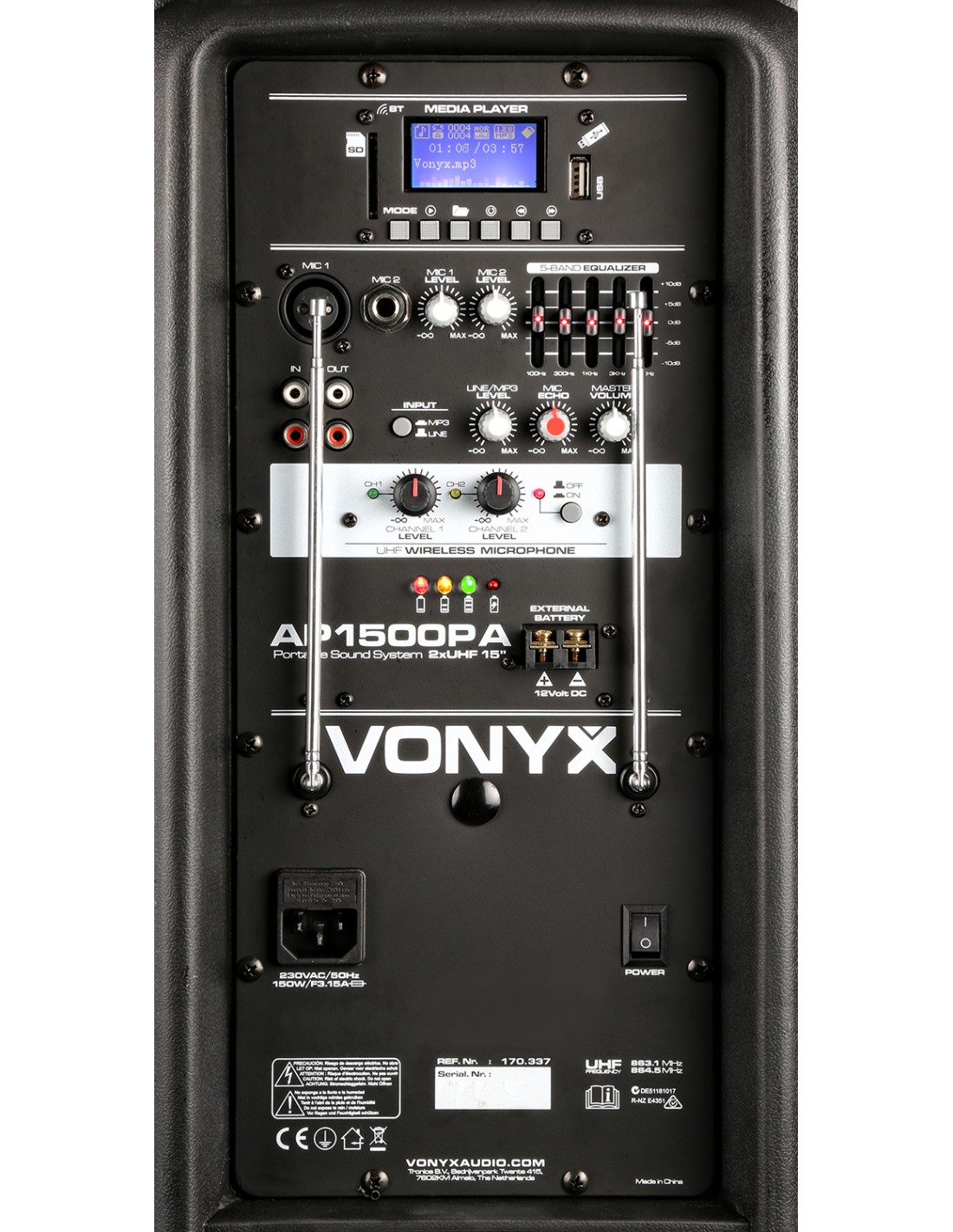 Bafle portatil PA profesional 15" 800W con mando a distancia, puerto USB integrado y lector SD Card para reproducir ficheros MP3. Este sistema "todo en uno" viene equipado con un receptor BT para reproducir en streaming y con 2 microfonos inalambricos UHF que operan los dos a la vez. Se alimenta a corriente o con bateria incorporada de 12V que lo hace totalmente independiente. Incorpora asas de transporte y ruedas. En la parte trasera trae dos entradas mas para microfonos de cable con efecto echo para todos micros, entrada AUX linea, controles de tono etc. Este sistema completo es indispensable en cualquier evento donde se necesite musica..