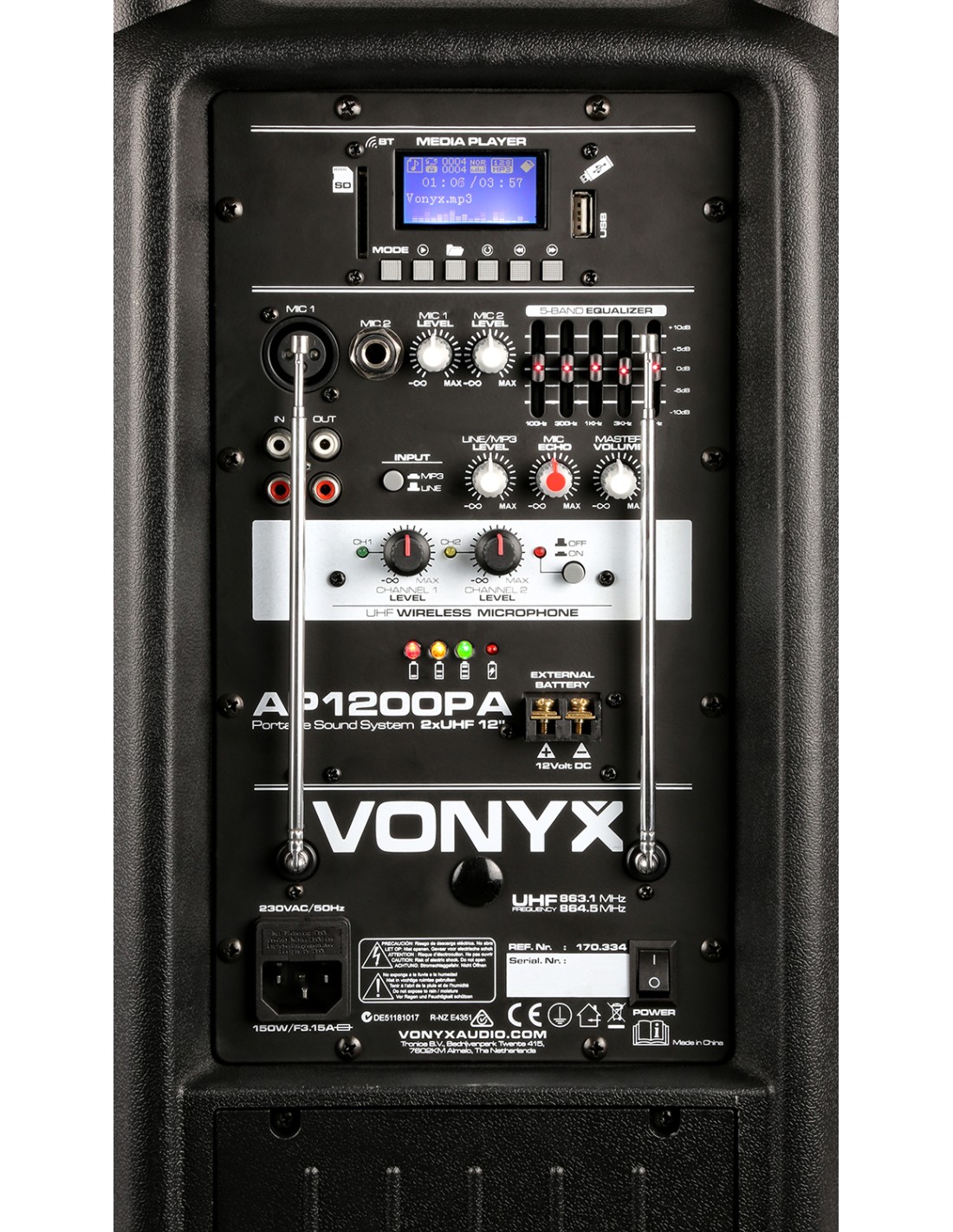Bafle portatil PA profesional 12" 600W con mando a distancia, puerto USB integrado y lector SD Card para reproducir ficheros MP3. Este sistema "todo en uno" viene equipado con un receptor BT para reproducir en streaming y con 2 microfonos inalambricos UHF que operan los dos a la vez. Se alimenta a corriente o con bateria incorporada de 12V que lo hace totalmente independiente. Incorpora asas de transporte y ruedas. En la parte trasera trae dos entradas mas para microfonos de cable con efecto echo para todos micros, entrada AUX linea, controles de tono etc. Este sistema completo es indispensable en cualquier evento donde se necesite musica..