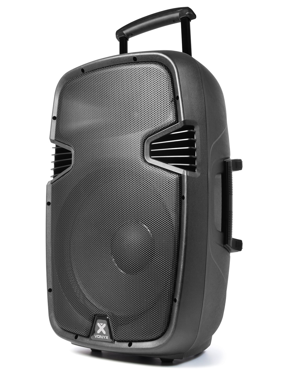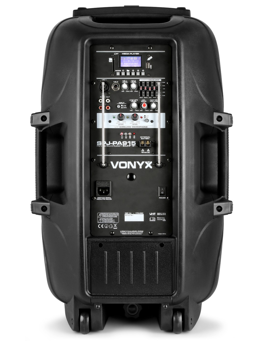 Sistema de sonido profesional movil de 15" 700W incorporando 2 micros inalambricos por UHF que operan en distintas frecuencias, mando a distancia y reproductor integrado de MP3 por USB y SD Card. Este sistema todo en uno, se alimenta por 220v o por bateria interna recargable de 12V para mover el woofer de 15" y motro de agudos. En la parte trasera encontramos 2 entradas para micro con efecto echo, entrada de linea, controles de MP3 y ecualizador de 5 bandas.