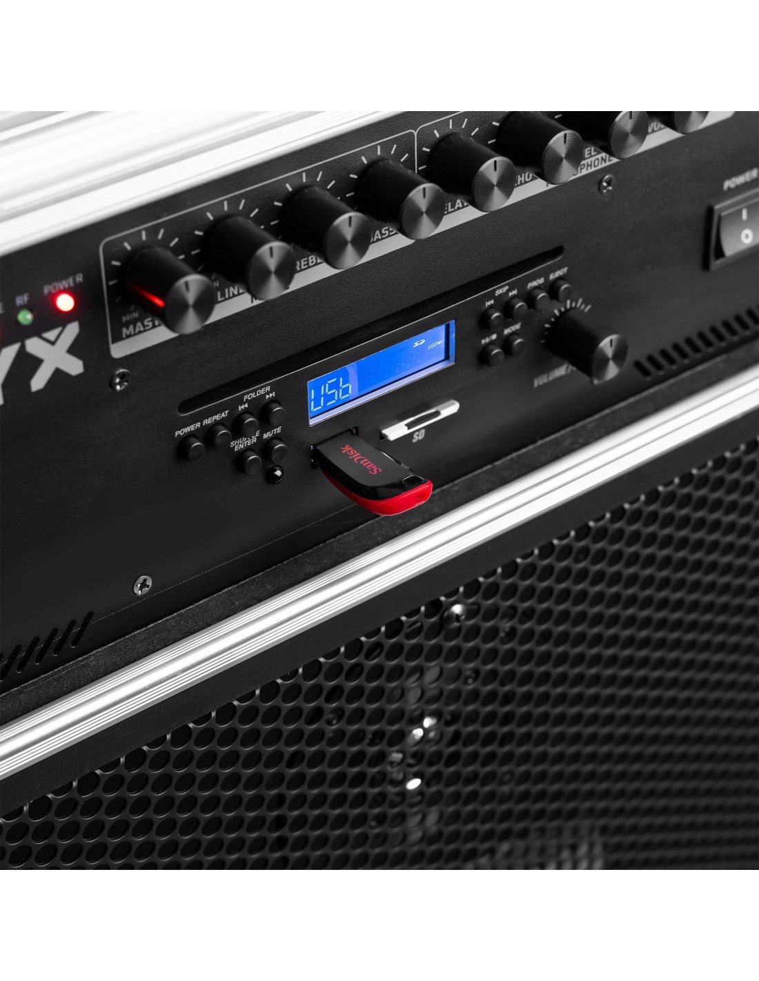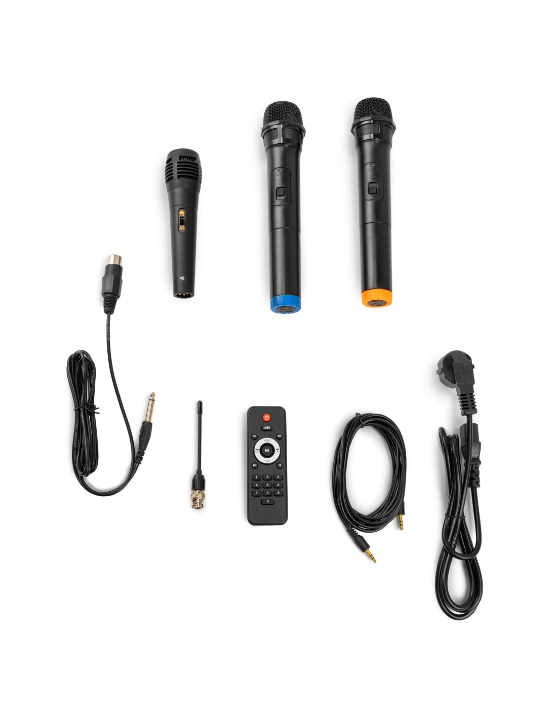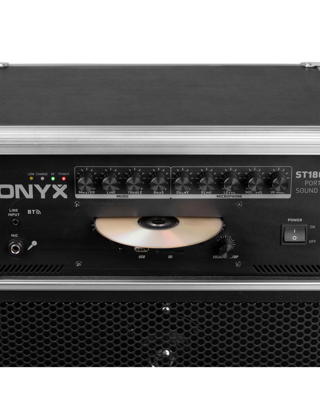 Sistema de sonido portatil de 12'' profesional con CD y MP3 e incorpora receptor BT para audio streaming. Incorpora amplificador de 450W y alimentacion por doble bateria en una carcasa portatil con ruedas. Se suministra con 2 micros inalambricos de mano UHF, mando a distancia, asa retraible y ruedas. De facil transporte y con posibilidad de trabajo sin toma de corriente es ideal para aplicaciones en escuelas, gimnasios, bailes, camping y fiestas de karaoke.