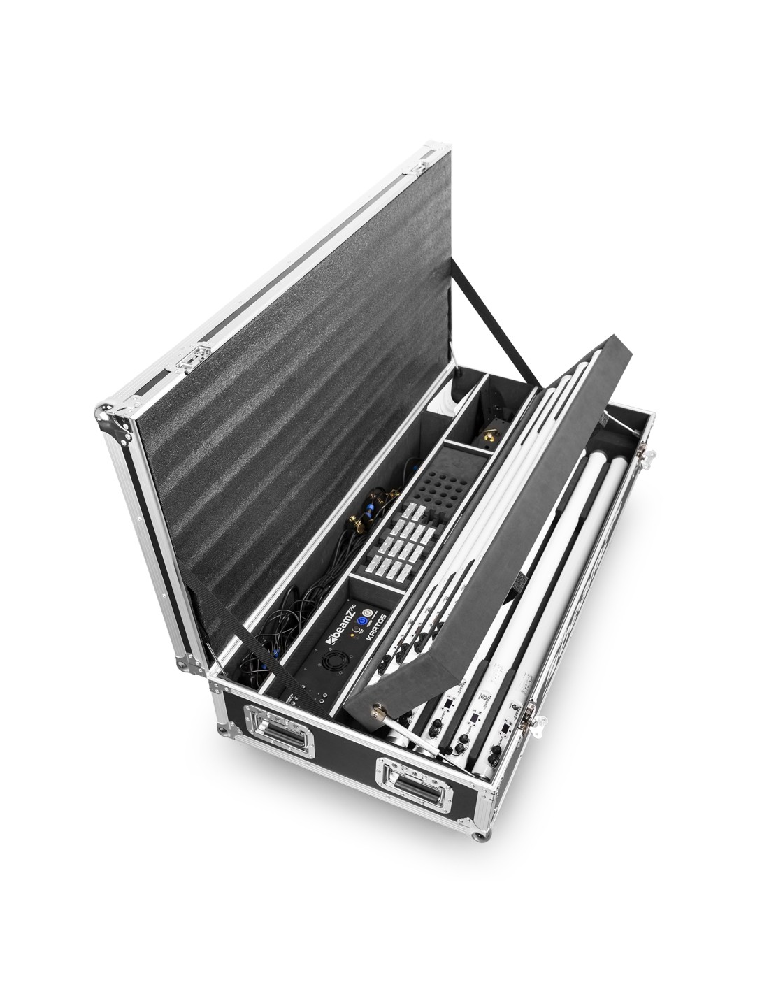 El kit Kratos Tube viene completo con ocho tubos Kratos y todos los accesorios esenciales que necesita para su próxima sesión o evento, en interiores o exteriores. Todos estos se almacenan en un flightcase protector que viene equipado con ruedas y asas para facilitar el transporte.
