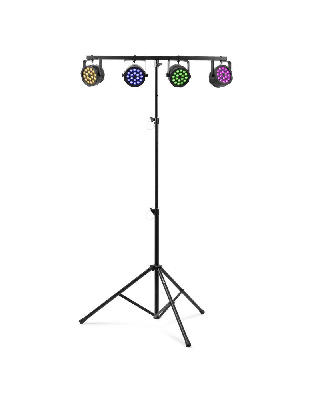 Soporte para luces muy ligero e ideal para grupos, bandas y disco movil. Incorpora una barra en T para colgar los focos Par u otro equipamiento. El tripode es facil de plegar y sus pasadores de seguridad ofrecen la resistencia necesaria para tus eventos.