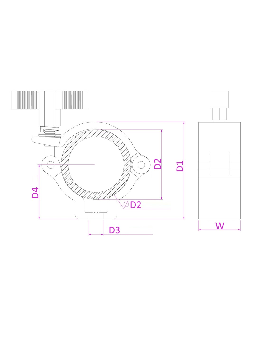 Garra de acoplamiento universal compacto de aluminio slimline para montar equipos en tubos y truss. Fabricado en aluminio de alta resistencia. Garra de aluminio de alta resistencia Fijacion por palomilla y tuerca