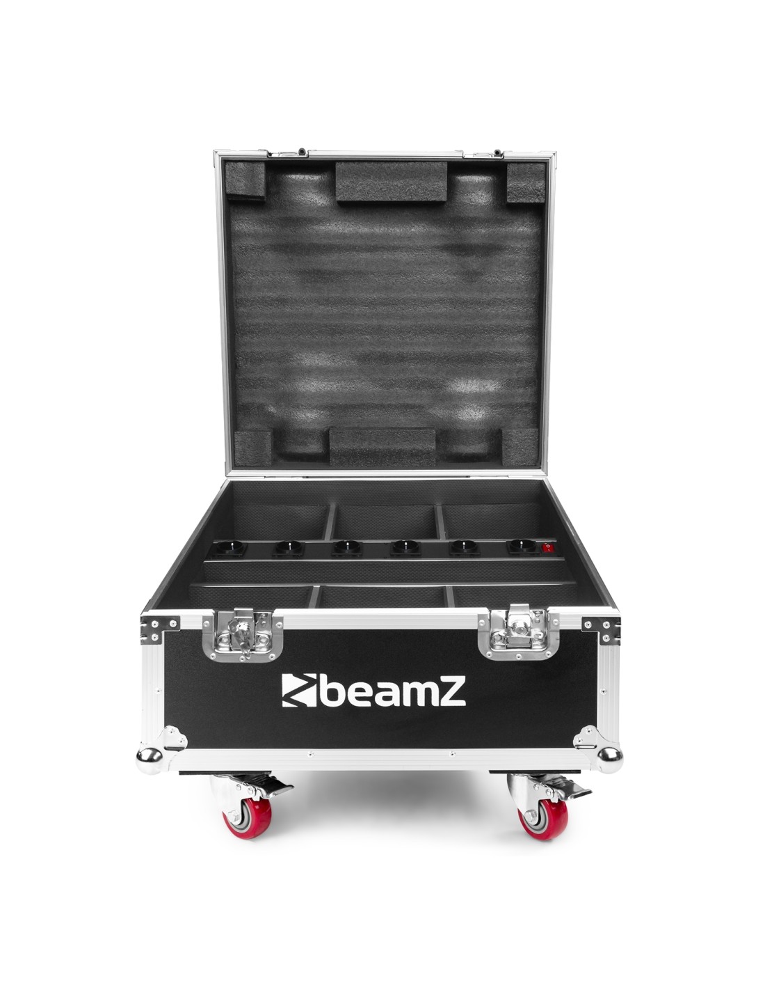 El flightcase BeamZ FCBP6 con cargador es la solución ideal para transportar y cargar sus unidades WBP612IP de batería. Este cajón duradero y con ruedas, incorpora asas para su fácil manejo. Al acabar el show, simplemente guarde todas sus barras en el flightcase y conecte la unidad a una toma de corriente. Al próximo día tendrá todas sus luces cargadas y listas de nuevo. Cada cajón aloja hasta 6 unidades con espacio suficiente para los cables de alimentación.