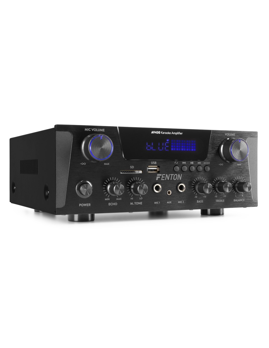 Los amplificadores AV430 son amplificadores de alta potencia muy bien diseñados y tienen un lujoso frente de metal en acero inoxidable cepillado. Estos amplificadores Hi-Fi compactos están equipados con un reproductor multimedia USB/SD integrado que le permite reproducir sus canciones MP3 favoritas directamente desde una tarjeta USB o SD. Gracias a la capacidad de transmisión inalámbrica BT, control de graves/agudos y eco y dos entradas de micrófono controlables por separado, estos amplificadores también son perfectos para aplicaciones como karaoke y música ambiental.